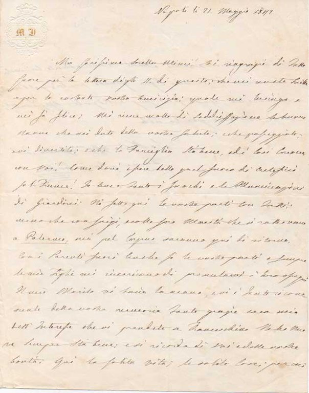 AUTOGRAFO“[.] Vi ringrazio di tutto cuore per la lettera [.]. Mi marito vi bacia la mano [.]. Qui la solita vita, le solite cose [.] mia figlia quando partirà per il Brasile [.]. Maria Isabella fu la seconda moglie, e la sola regina consorte, di Francesco I re delle Due Sicilie. La figlia Teresa Cristina divenne imperatrice del Brasile sposando Pietro II.