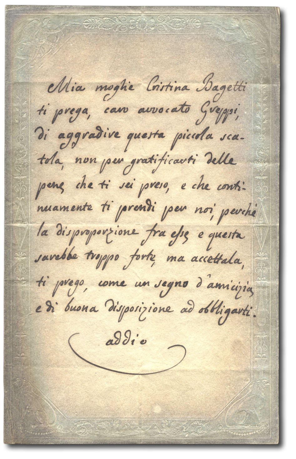 >1 pagina in-8 su carta da lettere dorata, con bordura decorata da motivi floreali e 4 motivi mitologici agli angoli. Lettera di accompagnamento per un presente consegnato dalla moglie "Cristina Bagetti" all'avvocato Greppi. "Ti prego di aggradire questa piccola scatola, non per giustificarti delle pene che ti sei preso, e che continuamente ti prendi per noi, perché la di sproporzione fra esse e questa sarebbe troppo forte..."