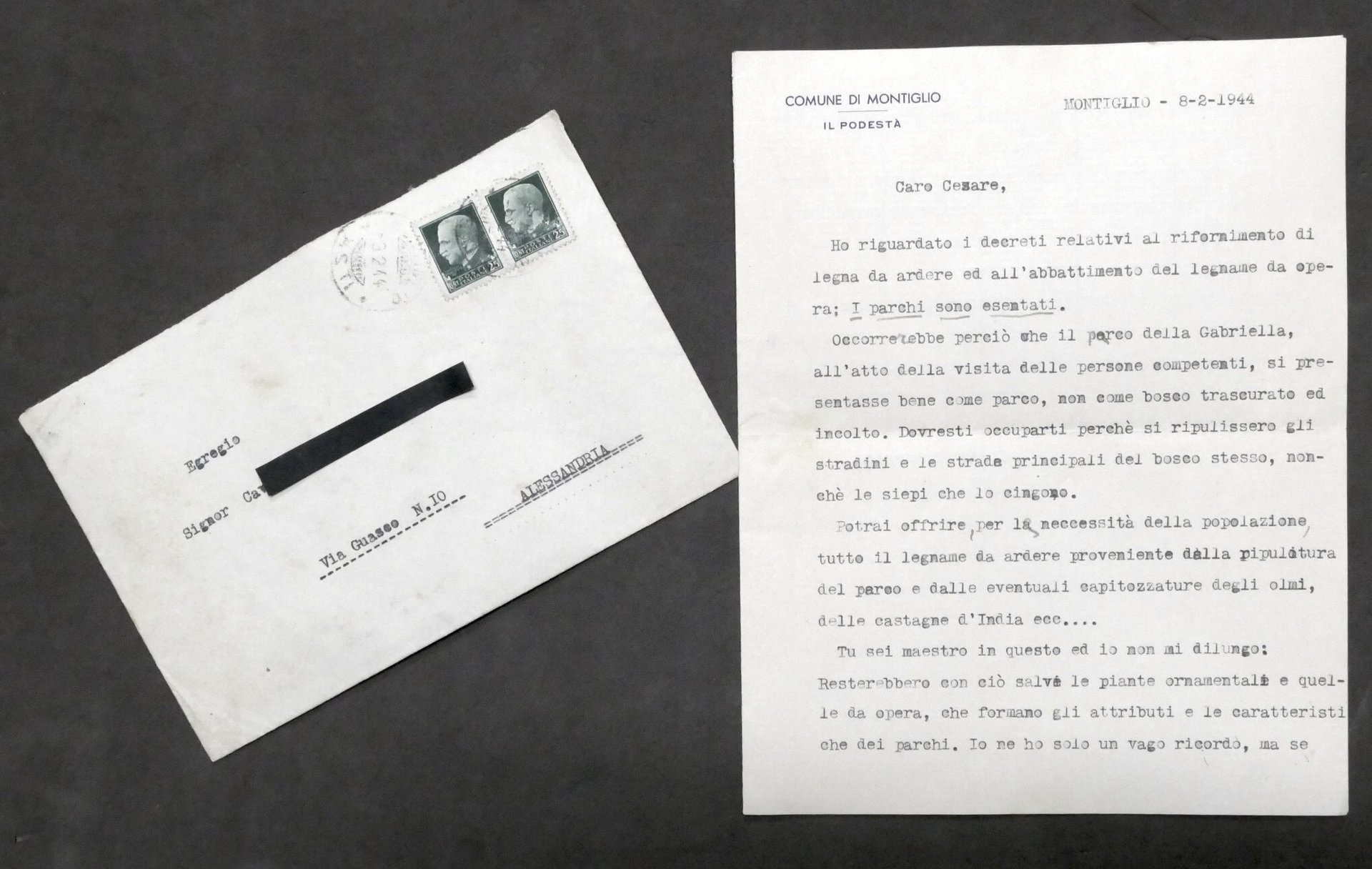 Lettera con autografo podestà di Montiglio, marchese Ignazio Borsarelli di Rifreddo - 1944 Lettera dattiloscritta su due facciate, dimensioni: 16 x 21 cm ca. Lingua italiana. Condizioni generali molto buone. Con busta d'invio allegata.