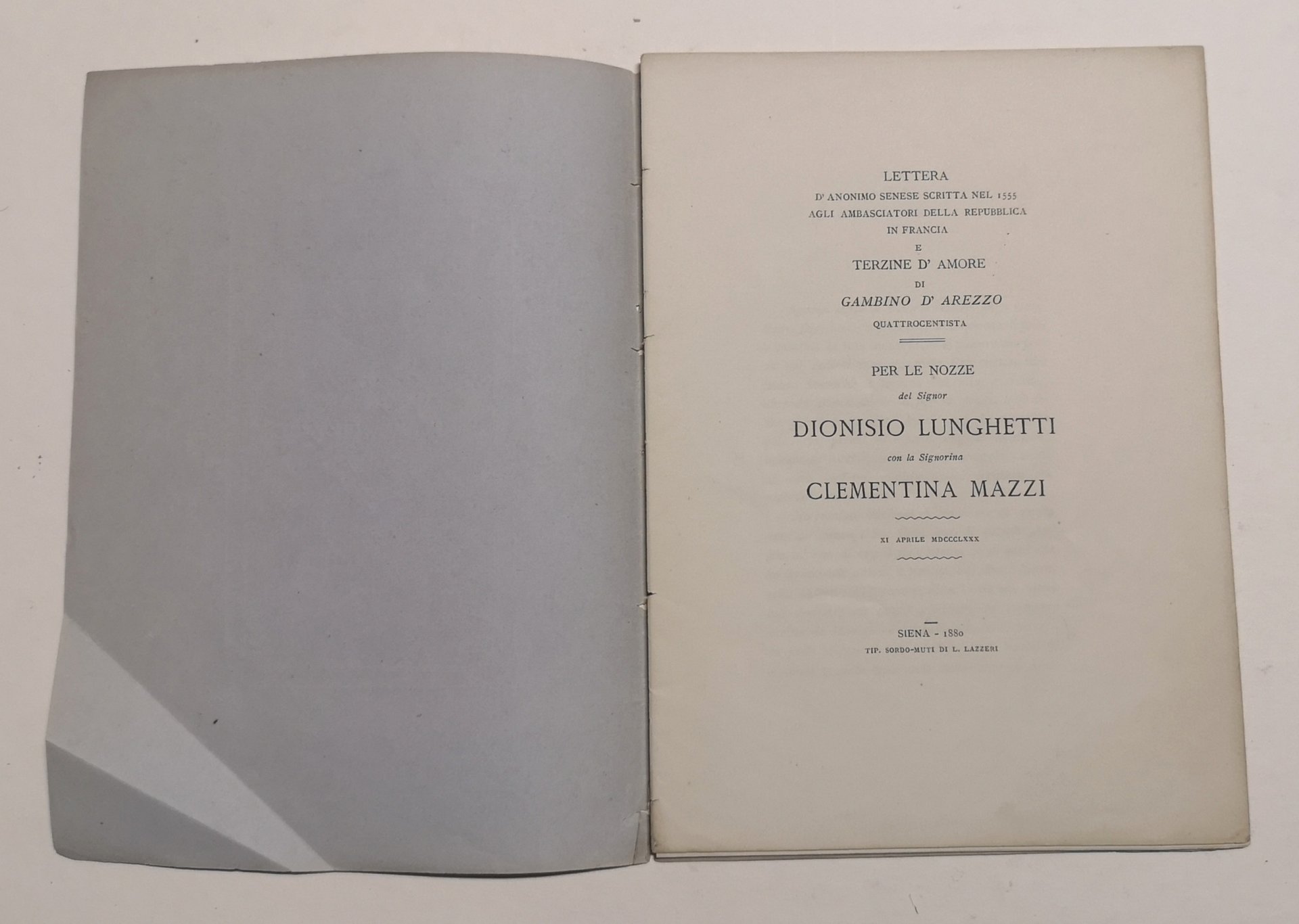 Lettera d'anonimo senese scritta nel 1555 agli ambasciatori della Repubblica in Francia e Terzine d'Amore di Gambino d'Arezzo, quattrocentista. Per le nozze del Signor Dionisio Lunghetti con la Signorina Clementina Mazzi. XI Aprile MDCCCLXXX.