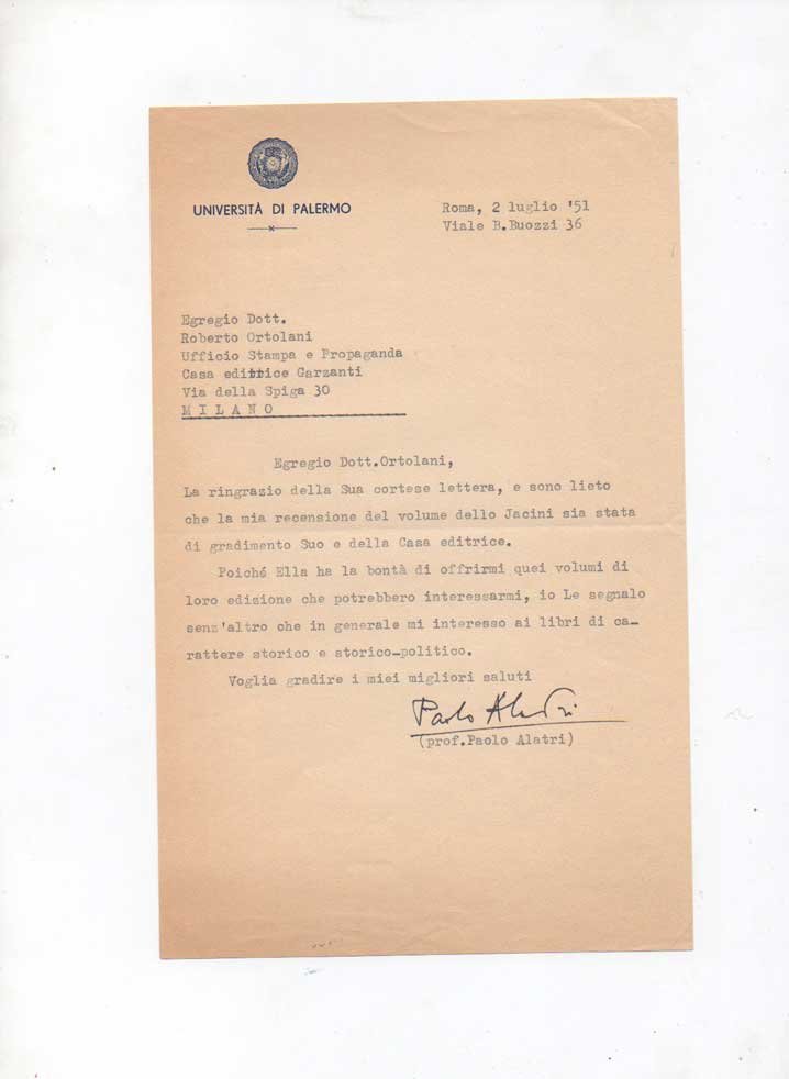 AUTOGRAFO230x145 mm, 1 carta (scritto il recto). Dattiloscritto e firma a inchiostro nero su carta filigranata, intestata "Università di Palermo". "[…] Sono lieto che la mia recensione del volume dello Jacini sia stata di gradimento Suo e della Casa Editrice". Alatri si riferisce all'opera di Stefano Jacini "Storia del Partito popolare italiano" con prefazione di Luigi Sturzo, pubblicata da Garzanti nel 1951.