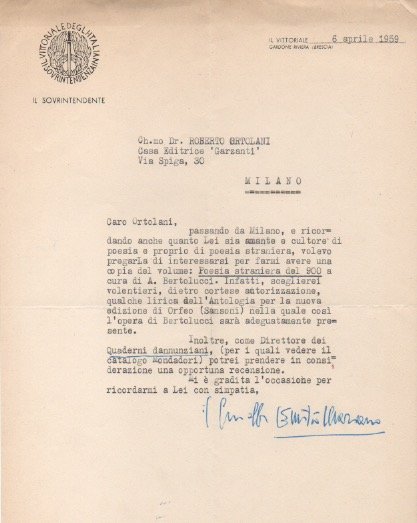 Lettera dattiloscritta con firma autografa, datata 6 aprile 1959 - Il Vittoriale, inviata a Roberto Ortolani - Garzanti.