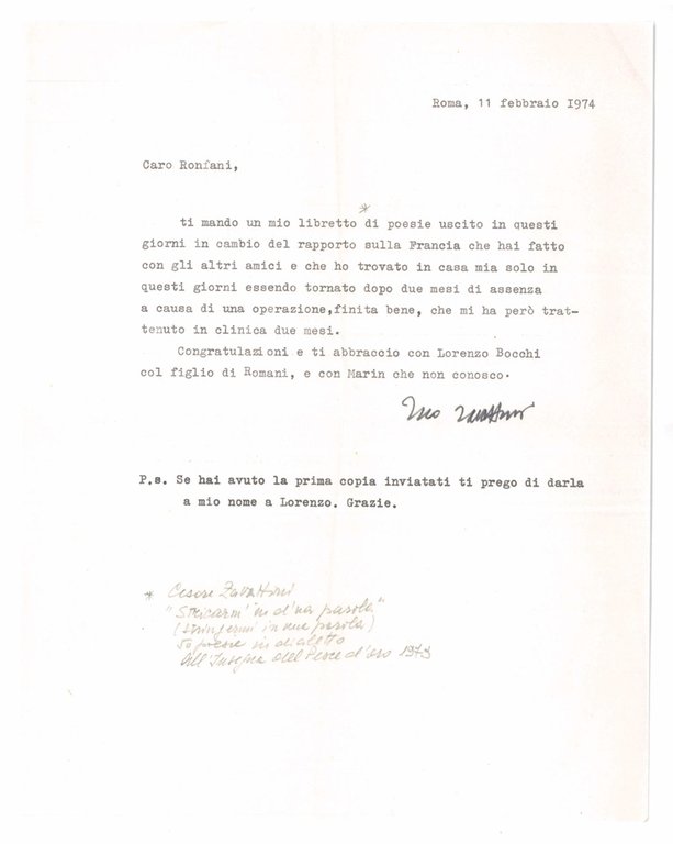 - 1 foglio (215x280 mm) scritto al recto in inchiostro nero, in nero anche la firma. Al piede della carta, nota a matita di altra mano, riferita al libretto citato: «Cesare Zavattini “Stricarm’in d’na parola” (Stringermi in una parola) 50 poesie in dialetto all’Insegna del Pesce d’oro 1973».