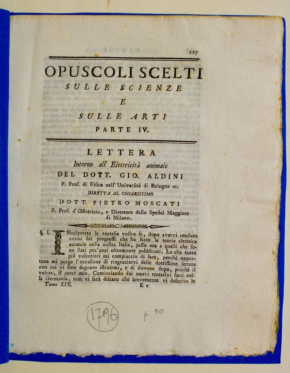 Lettera intorno all'elettricità animale…al…Dott. Pietro Moscati…