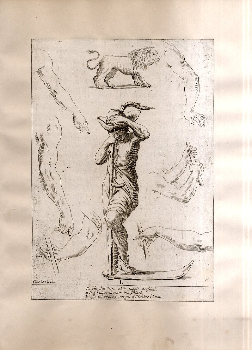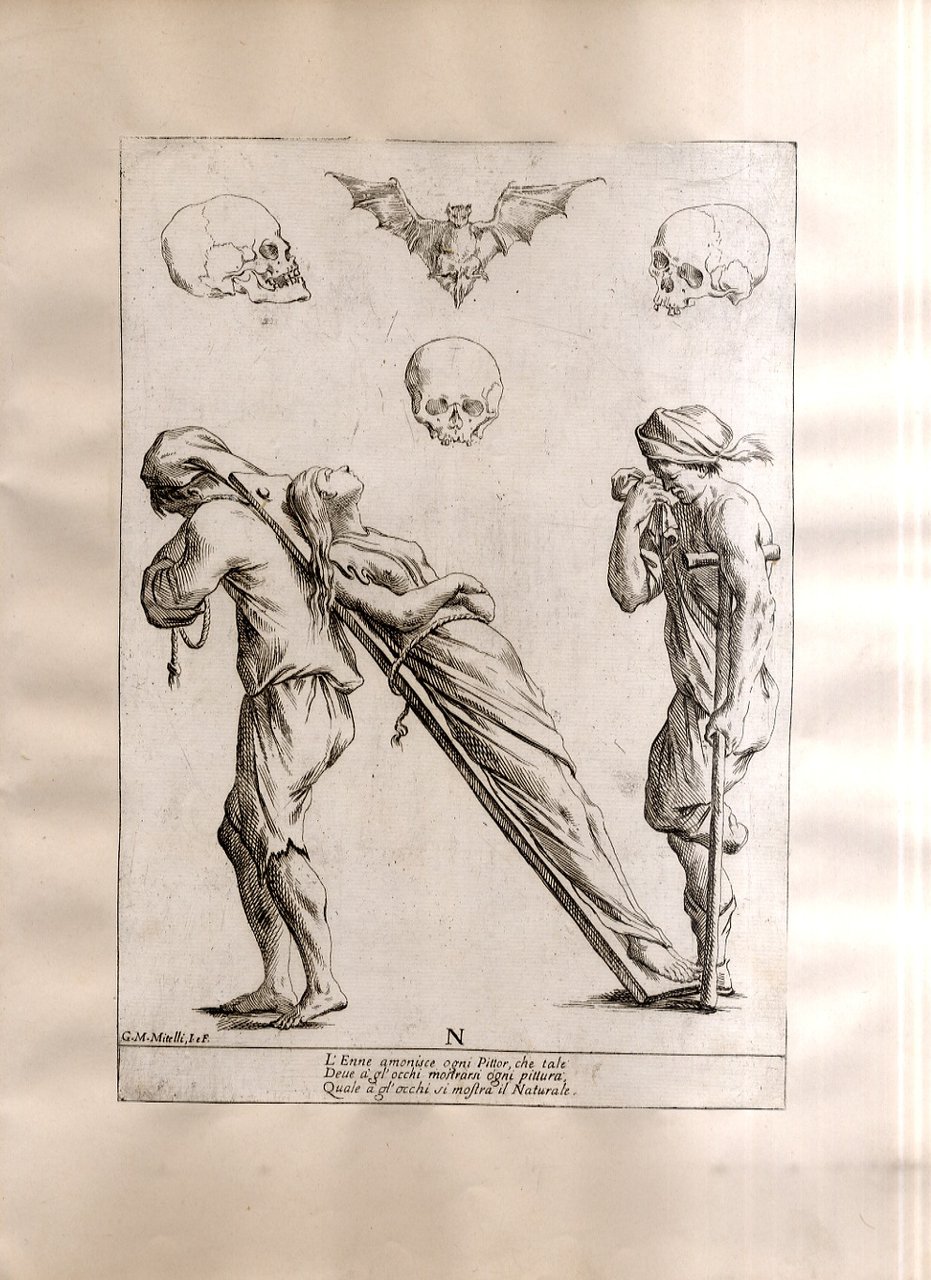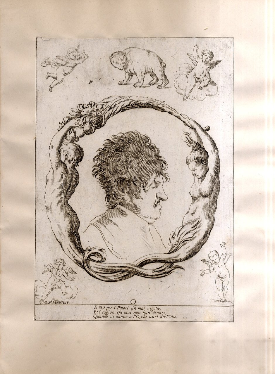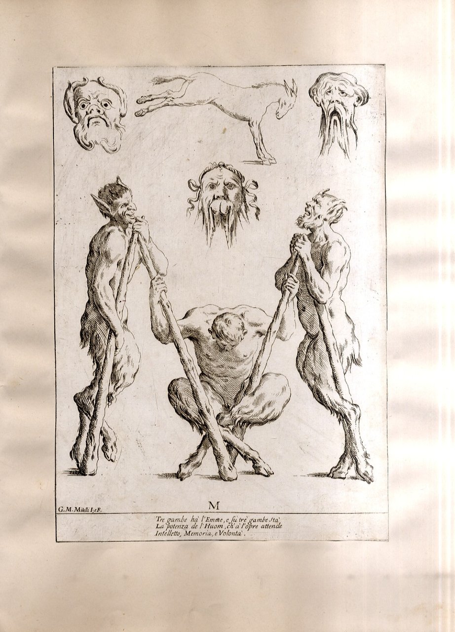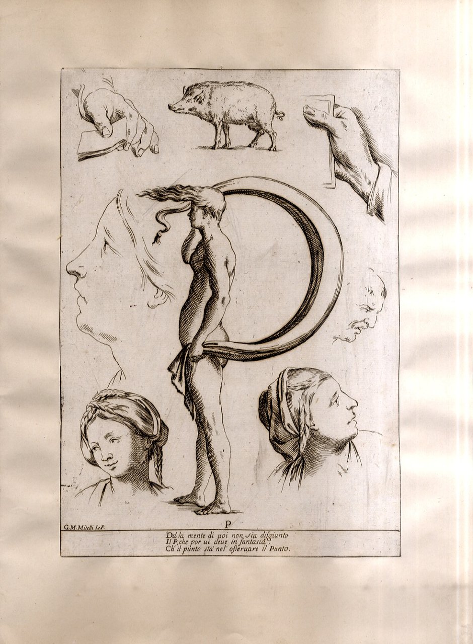 >Incisione all'acquaforte, foglio cm 27x19 applicato su carta antica. Tratta da '' Alfabeto in sogno''. Esemplare per disegnare di Giuseppe Maria Mitelli pittore Bolognese. L'incisore e pittore bolognese Giuseppe Maria Mitelli pubblicò nel 1683 l'“Alfabeto in sogno”, un manuale di disegno in cui le lettere della lingua italiana prendono la forma di corpi umani, congiunti fra loro o con altri esseri viventi e oggetti. Mitelli, nell'introduzione dell'opera, racconta di essere stato visitato in sogno da Morfeo. Il mitologico ministro delle apparizioni oniriche circondò l'artista con forme e visioni pertinenti alla nobilissima arte del Disegno “nostro unico diletto, e mio singolar esercizio: egli mi rappresentò le lettere dell'Alfabeto formate da incomposti fantasmi e da confuse immagini, e mi comandò che dovessi disegnare in proporzionate figure quegli embrioni, che, appena nati, svaniscono.Onde, io di subito svegliato, qui li ho disposti con simmetria, e alla vostra diligente applicazione dedicati”.