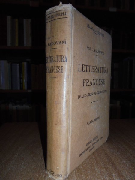 Prof. G. Padovani. Milano, Ulrico Hoepli, 1925. Letteratura Francese dalle origini ai giorni nostri. Seconda edizione riveduta e corretta. In - 16°, cartoncino edit. xvi, 577 pp. Ben conservato.