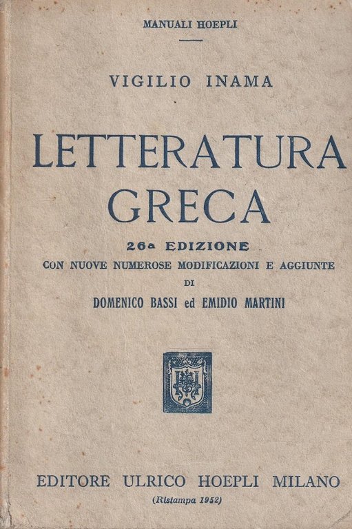 Letteratura greca 26^ edzione con nuove modificazioni e aggiunte di Domenico Bassi ed Emidio Martini
