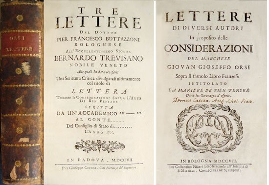 Lettere da diversi autori in proposito delle "Considerazioni" del Marchese Giovan Gioseffo Orsi sopra il famoso Libro Franzese intitolato "La Maniere de Bien Penser dans les Ouvrages d'Esprit". [Junto con:] Tre Lettere del Dottor Pier Francesco Bottazzoni all'Eccellentissimo Signor Bernardo Trevisano, alle quali ha data occasione una Scritura Critica divulgatasi ultimamente col titolo di Lettera toccante le considerazioni sopra "L'Arte di Ben Pensare" l'Anno 1705.