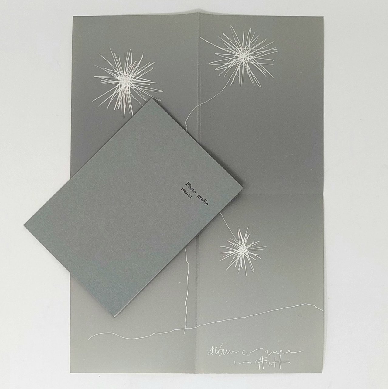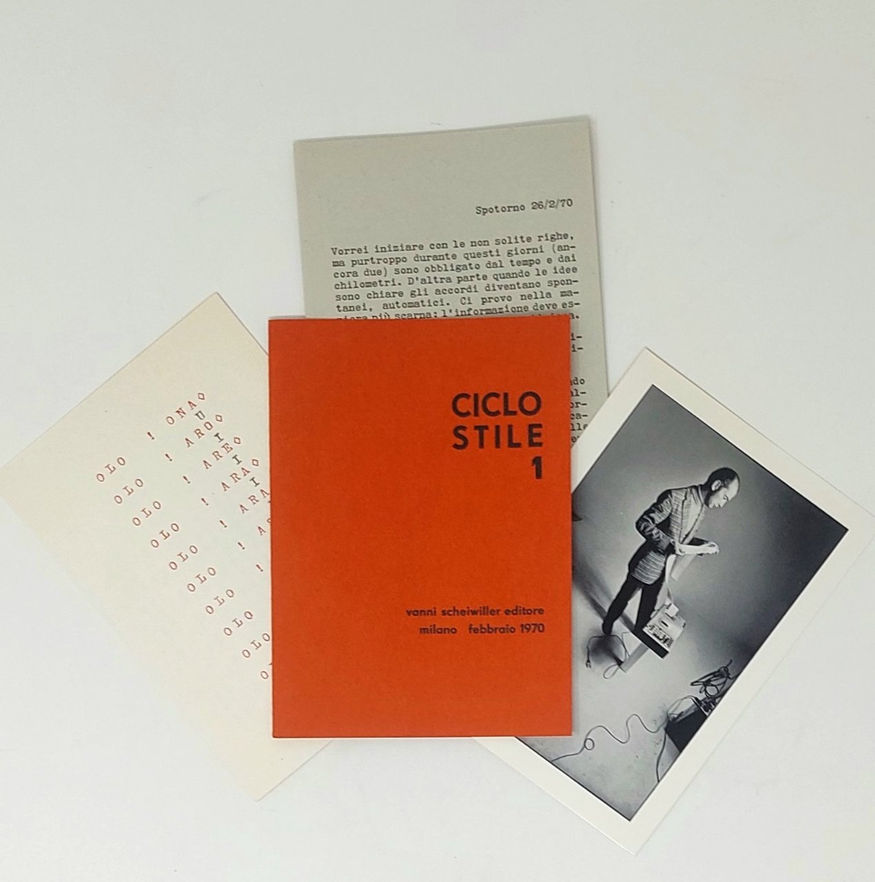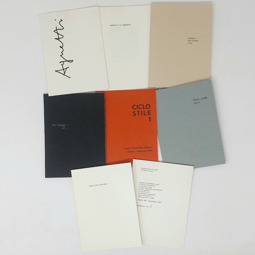 >Cofanetto con cartellette editoriali in-24, contenenti ciascuna riproduzioni di opere di Agnetti. 1) Frontespizio, ff. (4). 2) Agnetti e il deserto, pp. 8: introduzione di Gillo Dorfles. 3) Lettere dal Quatar. 1969: 4 lettere in fogli sciolti, tra cui "Lettera dal Deserto 1969", e una che "è stata riprodotta volutamente chiusa e tocca al lettore di aprirla" (cfr. Sheiwiller, nota dell'editore). 4) Ciclo stile 1, 1970: pp. 8, 1 “Fotoritratto 1972” di Ugo Mulas, (4). 5) Tre villaggi, 1977, 5 fogli sciolti su carta uso mano, sagomata e impressa a secco. 6) Photo-graffie, 1980-1981: 2 fogli sciolti colorati e ripiegati in 4, che riproducono due photo graffie di Agnetti, ossia pellicole fotografiche annerite dall'esposizione alla luce, su cui l'artista interveniva con graffi e colori. In fine 4 ff. non numerati di colophon. Tirato in 300 esemplari fuori commercio (ns. senza numerazione segnato a.l. al lapis), la raccolta è un minuto capolavoro di tipografia e grafica, dedicata alla memoria di un artista originale e di fondamentale importanza per le sperimentazioni concettuali a partire dagli anni '60, nonché uno dei maggiori protagonisti della neoavanguardia italiana. Dall'introduzione di Scheiwiller si apprende che una strenna di Paolo e Paola Franci dedicata a Vincenzo Agnetti doveva uscire alla vigilia di Natale 1973, col titolo XIV - XX, ma l'idea naufragò e 10 anni dopo, in occasione della morte improvvisa dell'Artista, si realizzò invece la presente edizione. Esemplare perfetto, salvo qualche macchietta al retro del cofanetto editoriale.