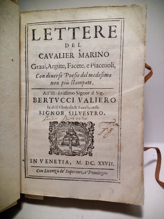 Lettere del Cavalier Marino. Gravi, Argute, Facete, e Piacevoli, Con diverse Poesie del medesimo non più stampate / All'Illustrissimo Signore il Sig. Bertucci Valiero sù dell'Illustris. & Eccellentis. Signor Silvestro / [Al final incluye] Poesie Diverse del Cavalier Marino non più stampate