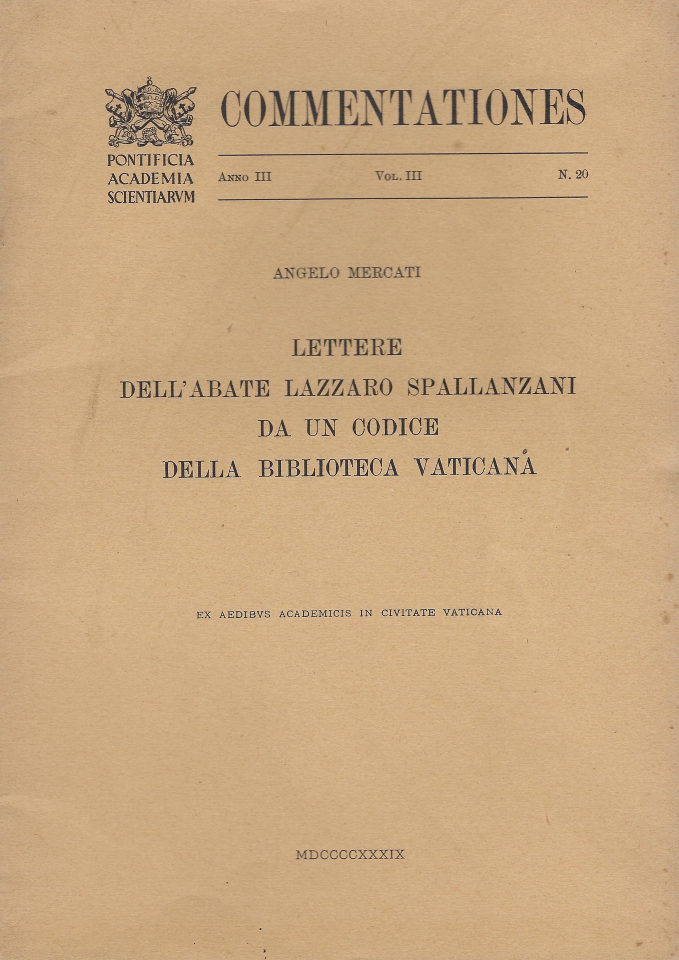Ex Aedibus Academicis in Civitate Vaticana, 1939. Collana Pontificia academia scientiarum. Commentationes, anno III, vol. III, n.20. brossura Buono (Good) piccole forature di tarlo sulle pagine, naturale ingiallimento dal tempo, leggibilità perfetta.