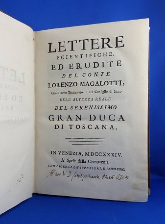 >in-4, pp. XXIV, 294, (2), leg. del tempo m. pelle, tit. e fregi oro al dorso. Seconda edizione (la prima era apparsa a Firenze nel 1721) di questa raccolta di 20 importanti lettere, procurata probabilmente da Tommaso Buonaventuri, tra le quali spiccano la IV, "Sopra la luce", diretta a V. Viviani e la VII, "Sopra un effetto della vista in occasione d'oservar la cometa l'anno 1664"; le altre riguardano la neve, il sangue, il vino, il veleno della vipera, gli odori, l'ovatta ("lanugine di Beidelsar"), ecc. Il Magalotti (Roma 1637 - Firenze 1712) fu letterato e scienziato, allievo di V. Viviani ed amico di Boyle. Ottimo esempl. (con antico ex-libris ms. nel margine inferiore del titolo). Riccardi II, 63, 2, note. Gamba 1978, note. Graesse IV, 335.