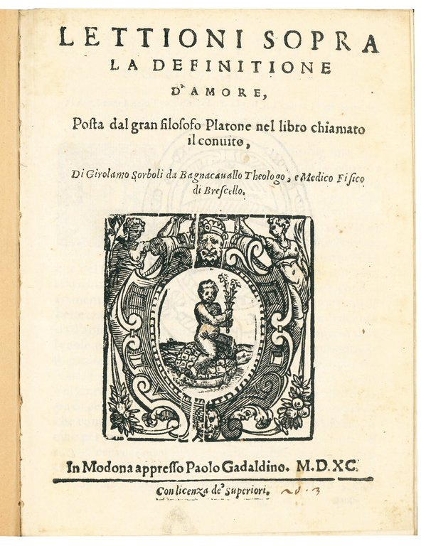 First edition. In 1590 Sorboli published the Lettioni sopra la definitione d'amore (‘Lessons on the Definition of Love') with a dedication, dated July 1590, to Paolo Emilio Boschetti, governor of Brescello and very close to the Este family. The work is a commentary on Plato's Symposium, in which Platonic discussions of the nature and effects of love, and the role of beauty, are interwoven with Christian and Aristotelian elements. Soboli was certainly influenced by the teachings of Francesco Patrizi, who was a professor of philosophy in Ferrara at the time. The Lettioni enjoyed a certain degree of success, as it was reprinted in Venice in a pirated edition by the publisher Girolamo Polo at the instigation of Flavio Candidi in 1592. Sorboli's brother-in-law, the Ferrarese poet Giovanni Antonio Vandali, contributed a laudatory poem to the dedicatee (l. ¶4r).