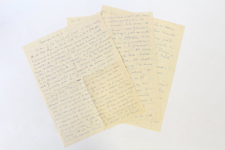 Copenhage [Copenhagen] 10 avril [1947] | 22.50 x 28.40 cm | 6 pages sur 3 feuillets | [ENGLISH DESCRIPTION ON DEMAND] | Très longue lettre autographe signée Dest au docteur Tuset et à Henri Mahé, datée du 10 avril [1947] à Copenhague, 130 lignes à l'encre bleue sur six pages pleines, corrections et soulignements de la main de l'auteur. La date indiquée par l'auteur du 10 mars est erronée, Naud n'acceptant de défendre Céline qu'en avril 1947. Pliures inhérentes à la mise sous pli ayant provoqué d'infimes déchirures sans manque de texte. Affaibli par son exil, Céline se réfugie dans sa correspondance où les multiples évocations du passé constituent des repères qui le rattachent à la vie. En 1947, Céline, poursuivi par la justice française pour son engagement collaborationniste, est reclus à Korsør, au Danemark. Epuisé par son isolement, Céline tente de maintenir un contact permanent avec son cercle d'amis français et parmi eux, le docteur Augustin Tuset, figure autour de laquelle gravite le monde des arts de Quimper, « cette petite Athènes au bord de l'Odet ». La période d'exil permet à Céline de renouer avec le monde de l'avant-guerre ressurgissant à travers les abondantes listes de noms parfois non identifiés : « et Mme. Le Gallou ? Et votre assistante ? Et Desse ? [.] Et les frères confitures, et leur grand-père divin ! et Le Floche ? Et Rosbras ? [.] Et Troulalaire ? Et notre si gentille crêpière. Je n'en aurais pas fini ». Les différentes époques de la vie de Céline s'entrecroisent dans la correspondance du Danemark, donnant à la mémoire un rôle à la fois néfaste et salvateur pour l'auteur : « Je suis inépuisable aux souvenirs. L'atroce est que je n'oublie jamais rien. Il faudrait bien que j'oublie certaines choses [.] Ah Marie Bell, mes amours ! [.] elle était vraiment extraordinaire dans Armide ! Ces choses-là ne s'oublient pas. Tout est poésie ! ». L'écriture de la lettre épouse le fil de la pensée de l'auteur, n'effectuant aucune transition entre les sujets : « Maria le Bannier nous écrit souvent. Je l'aime bien. C'est un tempérament et tout un trésor de Bretagne. Et Saudemont ? Vers quelles ivresses ? Serre bien la main de Pipe. Affection à Stève. [.] comment va la mère de Madeleine ? Nous parlons souvent de la « Puce ». Leur pauvre petite chatte. » Aucune affaire n'est épargnée par la soif de Céline de retrouver les repères familiers dans sa solitude où finit par poindre la fatigue qui l'accable : « Jusqu'où vont nos souvenirs. » A l'instar de plusieurs autres missives de la correspondance danoise, cette lettre est destinée à deux interlocuteurs : le docteur Tuset, mais aussi le peintre Henri Mahé, qui présenta d'ailleurs le premier à Céline. Le ton change significativement lorsque l'écrivain, s'adressant à son ami de longue date, quitte cette bienveillance nostalgie pour laisser éclater sa colère : « [.] prévenez Henri que Karen est à rayer une fois pour toutes ! ». Ici s'ouvre le long et virulent récit de l'un des tournants principaux de l'épopée du Danemark. Céline avait, avant son exil, confié de l'or à la danseuse Karen Jensen (dédicataire de L'Eglise). Assistée d'Ella Johansen, cette dernière mit des appartements à la disposition des Destouches qui s'y réfugièrent à leurs sorties respectives de prison. Dépositaires de l'or de Céline dont la réserve diminue de manière suspecte, les deux femmes sont ici violement prises à partie : « Elle [Karen] et son amie se sont comportées comme des sorcières de Macbeth et en plus pillardes, canailles. Des monstres. Elles ont littéralement torturé la pauvre Lucette. Deux mégères en délire [.] Son amie Johansen, ivrogne aussi hystérique, méchante, envieuse, un monstre. ». Céline va même jusqu'à les comparer à « Landru [.] plus timides, plus sournoises, mais textuelles ». La colère doublée de frustration de Céline n'épargne personne, pas même sa propre fille : « La mienne d'enfant, Colette, végète à Paris, la pauvre conne » L'exil mais surtout la période