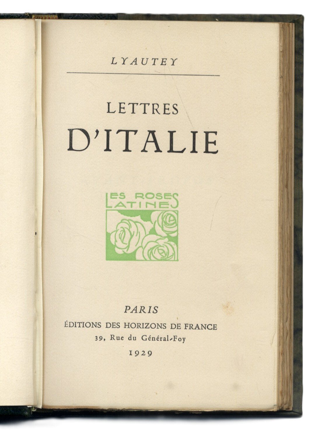 >in-16, pp. (10), 113, (5), leg. m. pelle, tit. oro al dorso. Lettere inviate ad amici da parte del ''capitaine de cavalerie'', poi ''chef d'escadrons'', Lyautey, ricordi di un soggiorno in Italia nel 1883 e di un veloce passaggio nel 1893. Tiratura di 1055 esemplari Manca a Fossati-Bellani.