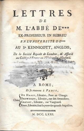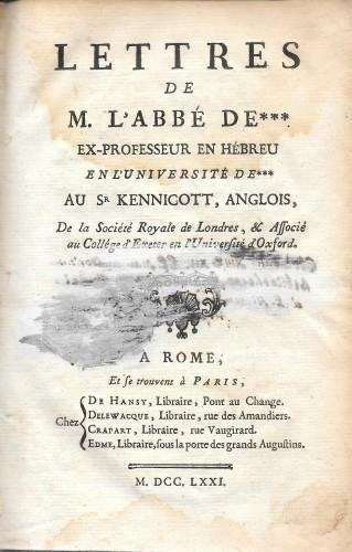 Lettres de l'abbé de*** ex-professeur en hebreu en l'université de*** au Sr Kennicott, anglois, de la Societé Royale de Londres.