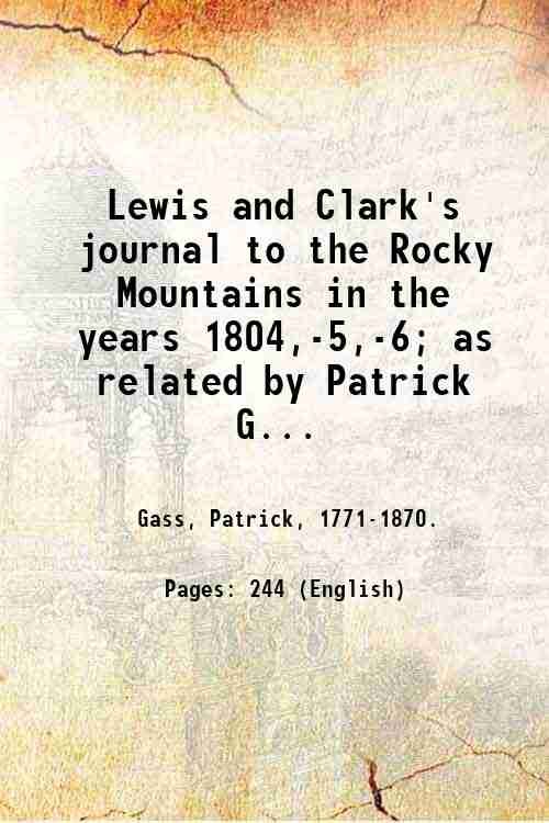 Lewis and Clark's journal to the Rocky Mountains in the years 1804,-5,-6; as related by Patrick Gass, one of the officers in the expedition. 1847