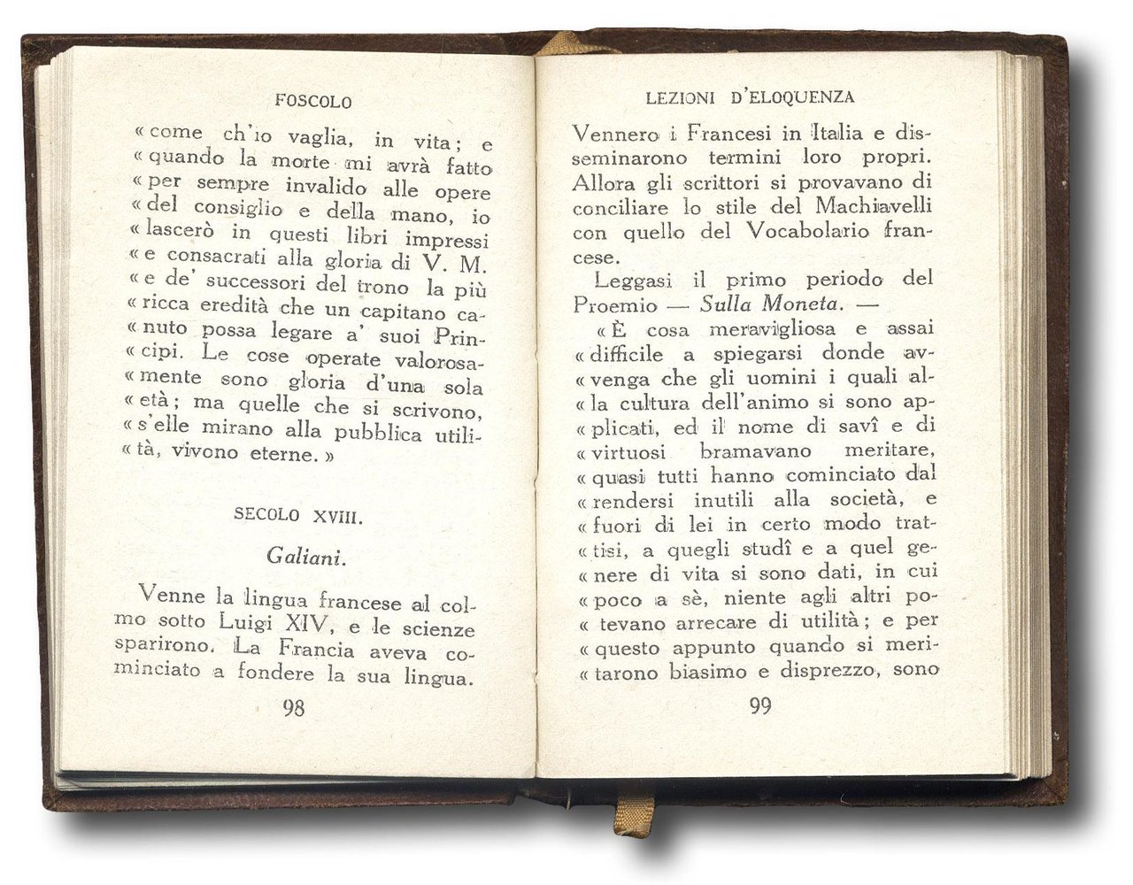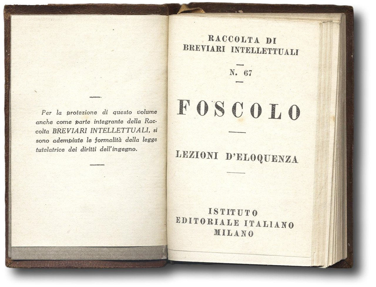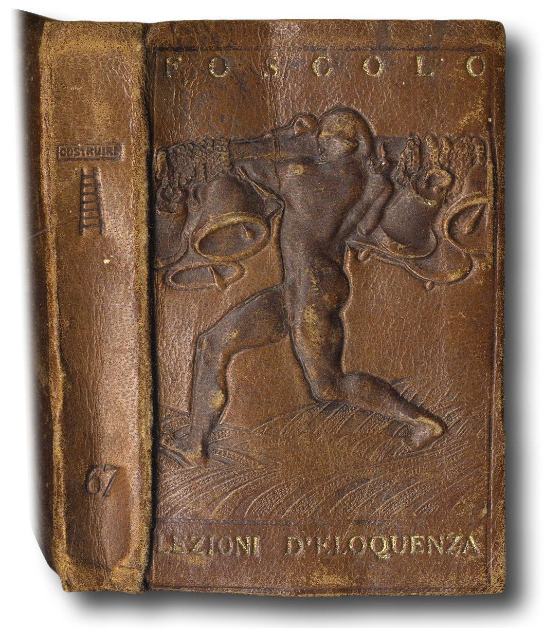>in- 24 (mm 95x63), pp. 291, (1). Bella legatura editoriale in pelle con decorazione in rilievo, autore e titolo impressi in oro nella parte superiore ed inferiore del piatto superiore, logo della collana e numero del volume (n. 67 della collana costruire) impressi a secco al dorso. Si tratta della versione a stampa di un ciclo di sei lezioni che Foscolo tenne a Pavia tra gennaio e giuno del 1809. Ottimo esemplare.