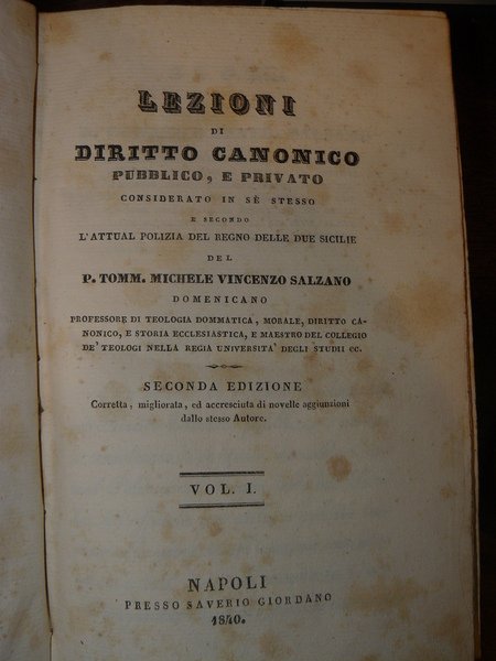 Lezioni di diritto canonico pubblico e privato considerato in sè stesso e secondo l'attual polizia del Regno delle Due Sicilie. Seconda edizione