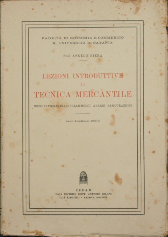 Nozioni preliminari sulle merci, avarie, assicurazioni - Anno accademico 1939-40 - Collana Facoltà di Economia e Commercio - R. Università di Catania - in 8° - pp.116 - Brossura editoriale - Testo in carattere corsivo - Fioriture alla brossura e in alcune pagine