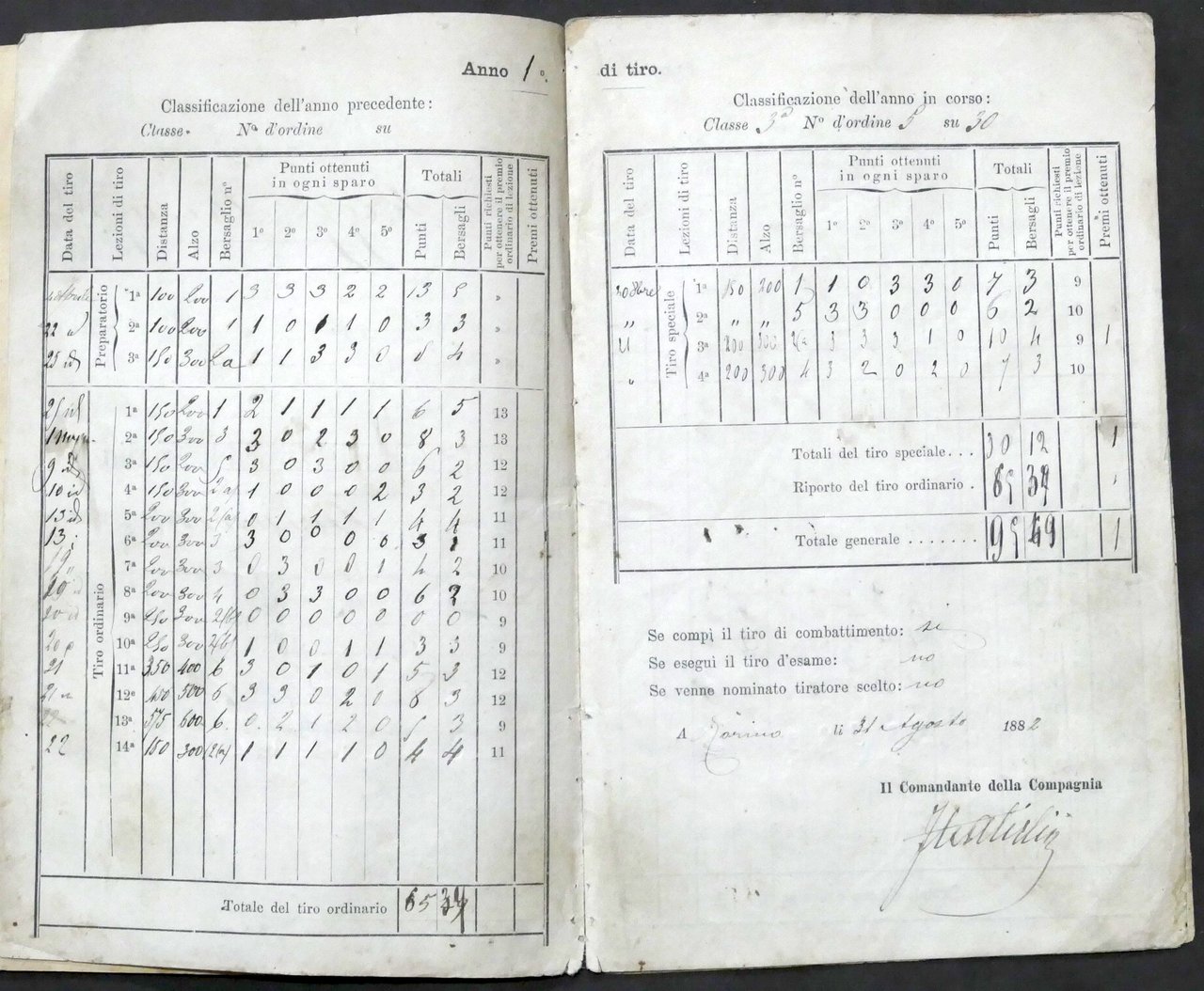 Libretto personale del Tiro al Bersaglio - 3° Reggimento Bersaglieri - 2^ Caompagnia - 1° Battaglione - 1882 / 1883 Pag. 7 in parte compilate Dimensioni: 12 x 19 cm ca. Lingua italiana. Condizioni generali buone. Piccoli segni del tempo.