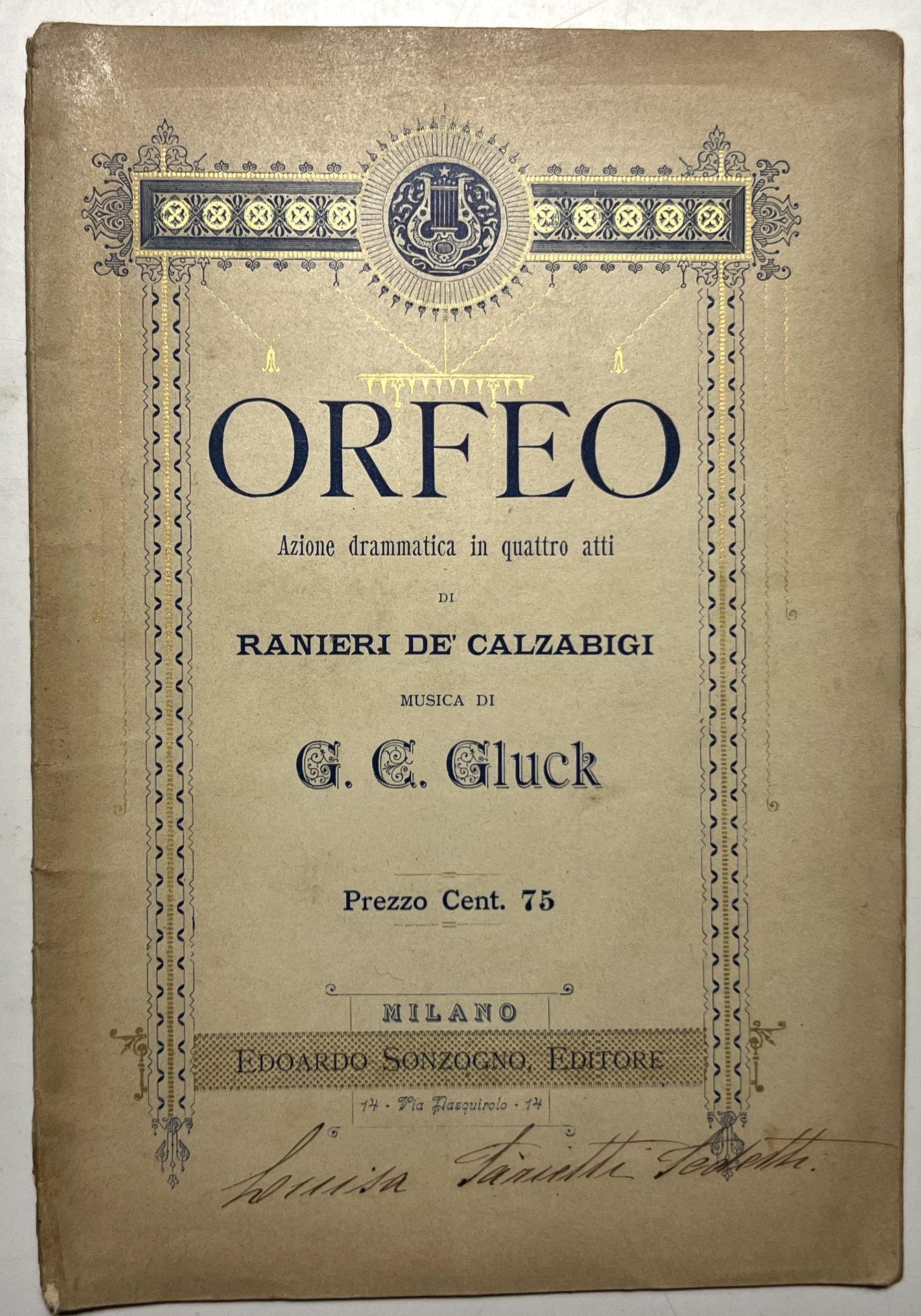 Libretto Opera - Orfeo: Azione Drammatica in Quattro Atti di R. Dè Calzabigi, Musica di G. C. Gluck - ed. 1888 Testo in lingua italiana. Pagine 30 Copertina morbida. Condizioni molto buone con piccoli segni del tempo come da foto.