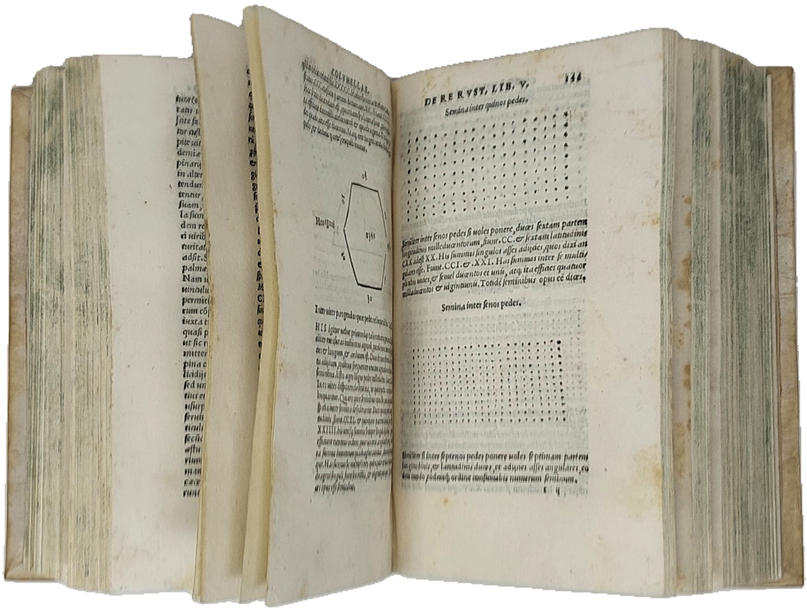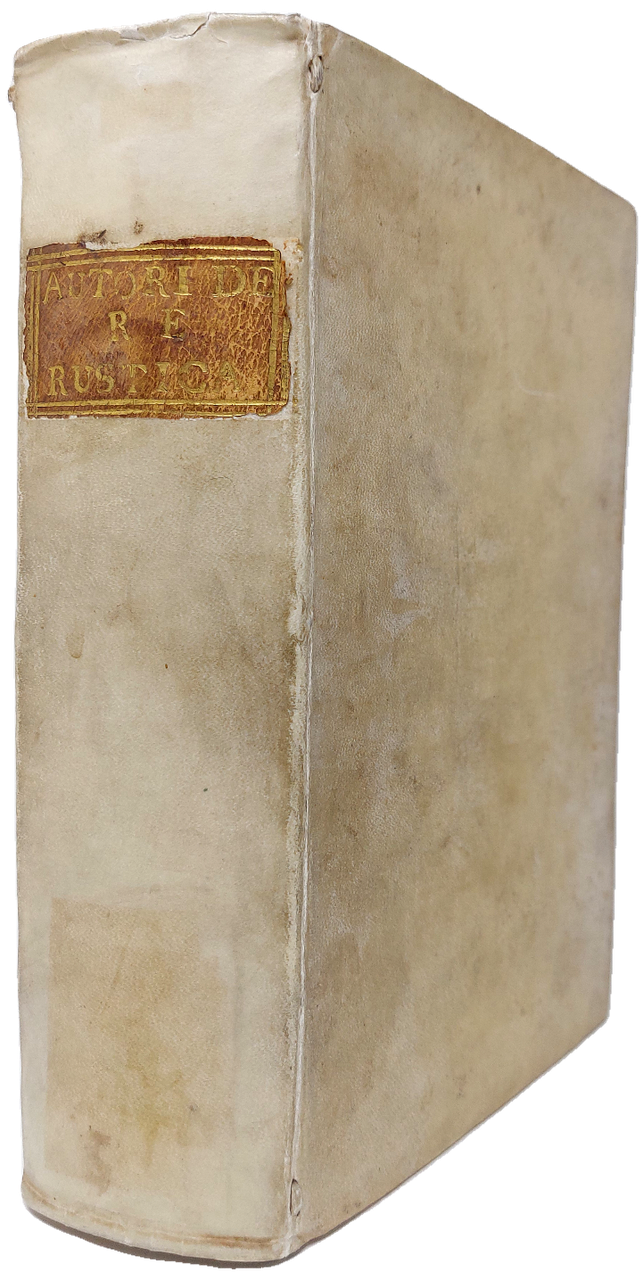 >2 parti in un vol. in-4 (207x133 mm), ff. (20 n. num.), 222; 125, (1, con impresa tipografica), figure in xilogr. n.t. che raffigurano strumenti agricoli, schemi di semina, misura dei campi ecc.; legatura settecentesca in pergamena, titolo in oro su tassello in pelle al dorso, tagli spruzzati d'azzurro. Ristampa dell'ediz. giuntina del 1515, curata e filologicamnte commentata da Niccolò Angeli e basata, con qualche correzione, sull'Aldina dell'anno precedente. Vi si raggruppano tutti gli antichi autori di opere concernenti i lavori agricoli e tutto quanto ha attinenza con essi e con i prodotti della campagna, include quindi anche la gastronomia, l'enologia, la meteorologia, la misurazione del tempo, ecc. Gli ultimi ff. preliminari recano una dedica di Aldo Manuzio al lettore contenente una lunga e puntuale spiegazione della divisione dei giorni e delle ore secondo quanto scrive Rutilio Palladio nella sua opera ("De duobus dierum generibus, simulque de umbris et oris, quae apud Palladium"). In questa edizione vi è poi l'aggiunta del commento di Giulio Pomp. Fortunato al libro X "De cultu hortorum" di Columella, con le note del Beroaldo. Ottimo esemplare, fresco e marginoso (timbro di biblioteca estinta al frontespizio, qualche nota di antica mano ai margini). Camerini I, 72. Bandinius II, 88. Renouard XXXIX, 67. STC. 29. Adams S-806. Simon, Bacchica II, n. 594. Simon, Gastr. 311. B. IN. G. n. 1800.