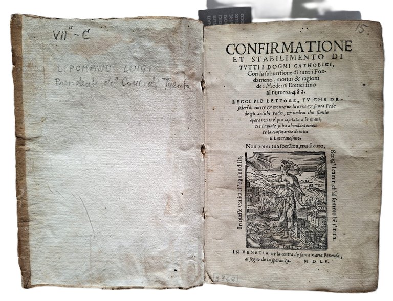 In-8°, mm. 155x120, carte (4), 652. Completo. Cartonato coevo. Piatto posteriore distaccato. Titoli manoscritti al dorso (sbiaditi). Leggera gora al lato inferiore di quasi tutto il volume, sporadiche fioriture. Piccoli lavori di tarlo al margine inferiore dalla carta 18 fino alla c. 100, con perdita di testo, altra galleria di tarlo dalla carta 90 alla carta 200 con perdita di testo, altra galleria di tarlo dalla carta 240 alla carta 273, una piccola macchia con perdita di testo alla carta 360, Un piccolo foro all'angolo inferiore destro della carta 399, mancanza al margine inferiore della carta 455. Capilettera xilografici. Note a matita recenti, e altre note a penna coeve. Tagli bruniti e impolverati, legatura con alcuni strappi, macchie e mancanze. Impressa in Venezia il 1555 (la prima 1553), opera di Luigi Lippomano (1496-1559) contro la dottrina protestante, tratta tra l'altro della dottrina della Chiesa: primato e infallibilità del papa (I), grazia, predestinazione e giustificazione (II), sacramenti (III). Opera originale di Maffeo Albertini (XVI sec.) e Giovanni Del Bene (XVI sec.) riveduta e ampliata dall'autore. Marca tipografica in xilografia al frontespizio.