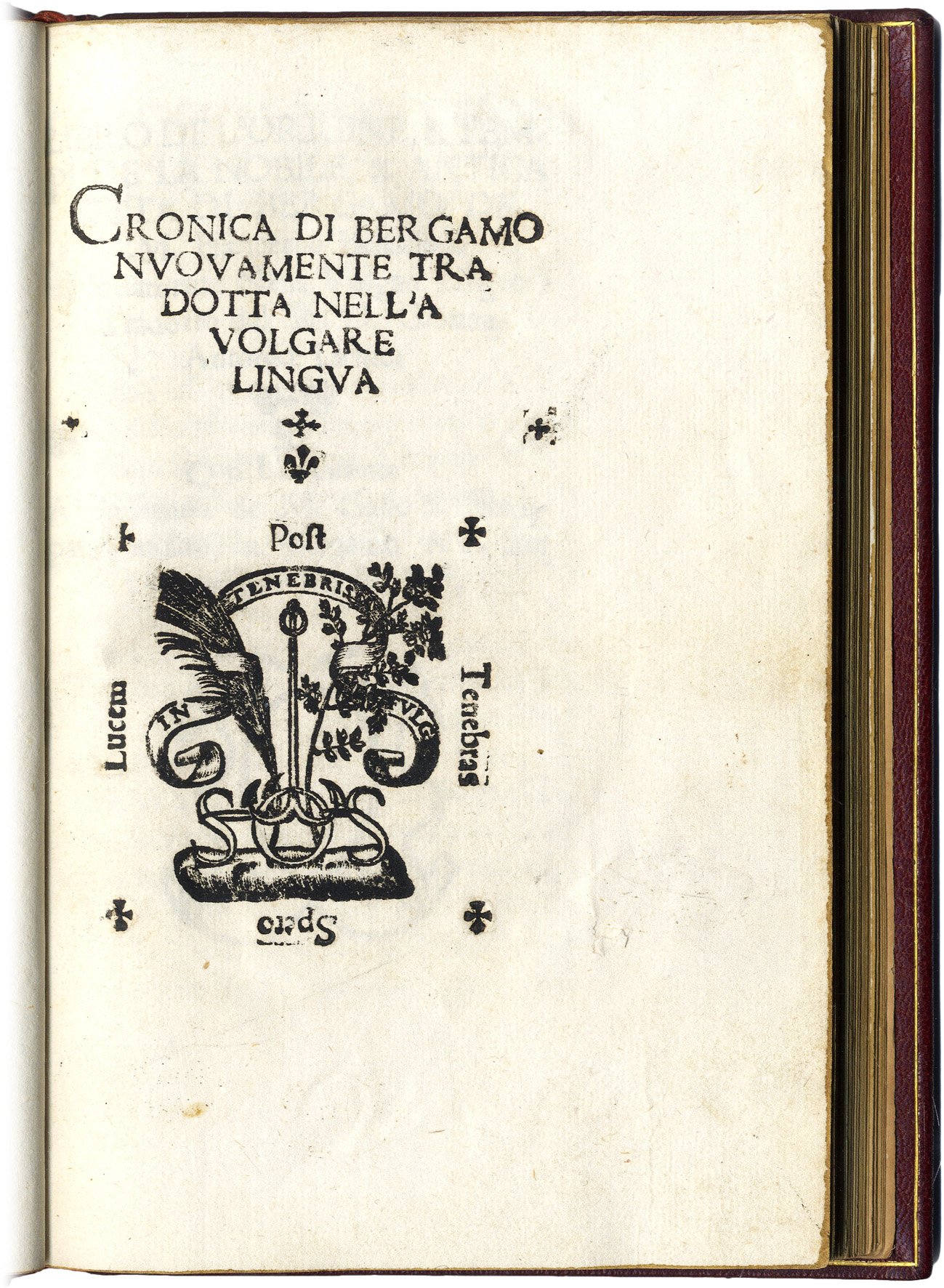 Libro de l'Origine, & tempi de la nobile, & antica Citta di Bergamo. Nouamente nella Volgar Lingua tradotto dal R.D. Giovan Antonio Licino. Con la Gionta.