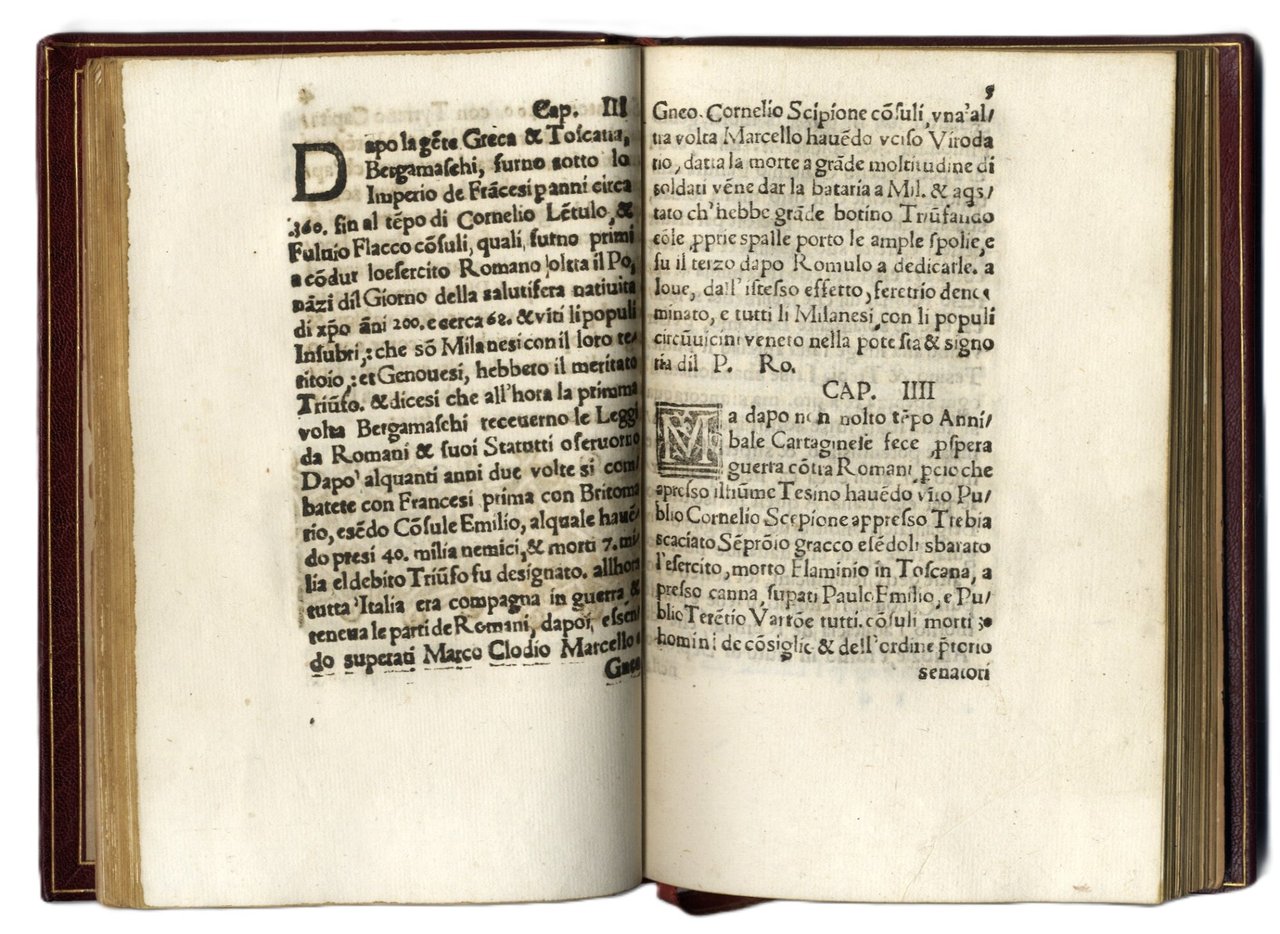 >in-4 piccolo (180x115 mm), ff. (14 non. numerati, il sesto è bianco), 59, (4). Legatura moderna in marocchino granata con titolo e nota tipogr. impressi in oro sul piatto superiore, dorso a nervi con titolo oro, duplice riquadro a filetto oro interno. Impresa tipografica sul primo f., ripetuta in fine; stemma stilizzato sul secondo f., bordura xilografica al f. 4, alcune iniz. e decoraz. xilogr. Titoli in stampatello, testo in car. romano. Prima traduzione italiana dell'opera del Bellafino e primo libro stampato a Bergamo, di cui riferisce eventi storici e, nell'ultima parte, vicende contemporanee all'autore (nato nella seconda metà del XV sec. e morto nel 1543). Il primo f. funge da occhietto: "Cronica di Bergamo / nuovamente tra / dotta nella / volgare / lingua"; al recto del secondo f. la nota "A In stantia de M. Gallo & Stampata per lui, In Bergamo A de 20: Nouembrio M.D.LV."; il secondo colophon si trova al verso del f. 59: "In Bergamo per Mi. Gallo Alli 20 di Aprile M.D.LVI.". All'inizio ed in fine due sonetti di Josepho Unicorno (probabilmente pseudonimi dell'autore o del traduttore), "sopra la opera presente" il primo, "sopra la citta di Bergamo" il secondo; nei ff. prelim. terzo-quinto vi è una "oratione" del Licino (o Licinio) "a li si. et cari suoi compatrioti" nella quale, tra l'altro, parla della necessità di tradurre l'opera del Bellafino "dal latino idioma in parlar commune a comodo del Populo e de quelli che della latina Lingua non sono così esperti". Opera di straordinaria rarità ed accattivante interesse storico-letterario e bibliografico; proveniente dalla famosa Broxbourne Library (con due ex-libris applicati ai piatti). Bell'esemplare, marginoso e fresco, lieve alone all'angolo di qualche foglio. Manca a STC., Adams e Bologna, Cat. Cinquecentine Trivulziana. Fumagalli pp.33-34. Ascarelli p.166. Deschamps col. 178. Cat. Unico 1035 (solo 8 esempl. in Italia).