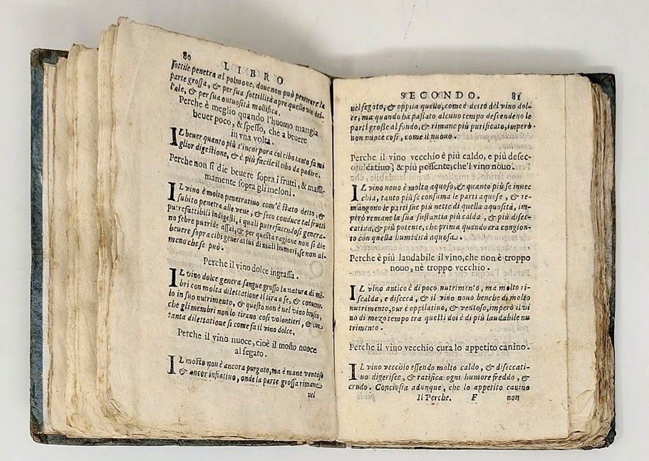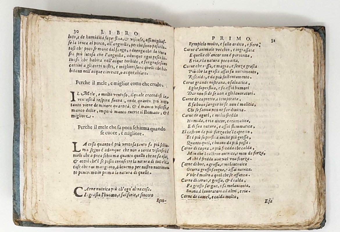 >in-8 (mm 154x95), pp. (32, bianca la carta b8), 314, (2). Conservata la carta bianca V6, mancano le ultime due bianche. Marca tipografica, incisa su legno, al frontespizio. Iniziali ornate silografiche. Legatura ottocentesca in cartonato azzurro; al dorso, titolo vergato su tassello cartaceo. Bell'edizione secentesca che testimonia la straordinaria fortuna dell'operetta del medico e astrologo bolognese, apparsa originariamente in latino - con il titolo di Liber de homine - nel 1474. Ristampato ancora nell'Ottocento, l'enciclopedico trattato vuol mostrare “le cagioni d'infinite cose, appartenenti alla sanità”, e nel primo libro affronta, più in particolare, questioni legate alla dietetica e alla alimentazione, fornendo ad esempio succinte e chiare risposte al ‘perchè nel verno si mangia cibi grossi, e di più nutrimento', o ‘perchè nuoce a mangiare latte con cose acetose overo con pesce'. Bell'esemplare, in barbe, usuali lievi fioriture. Westbury 143; Paleari Henssler 460; B.IN.G. 1123 nota.