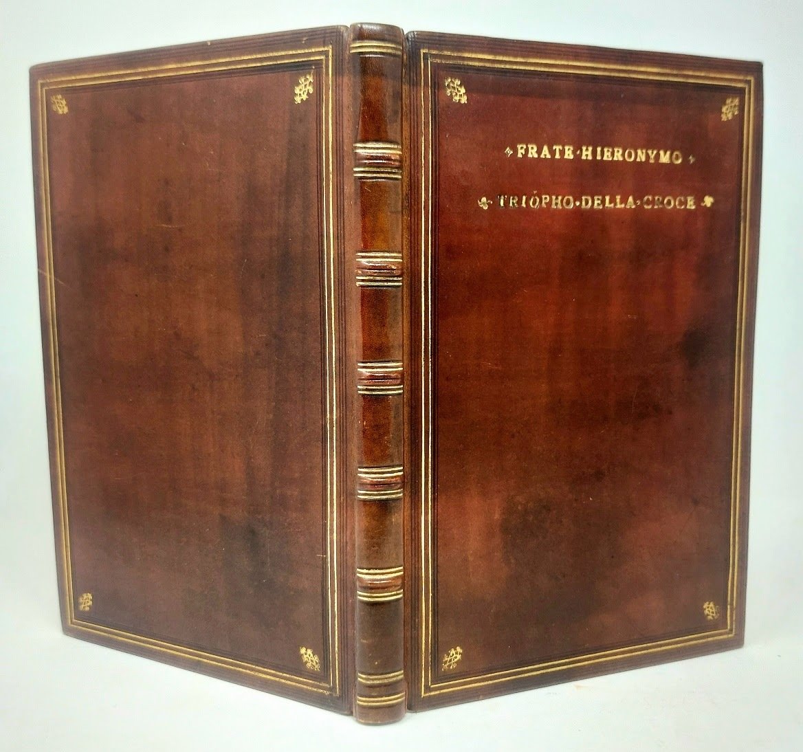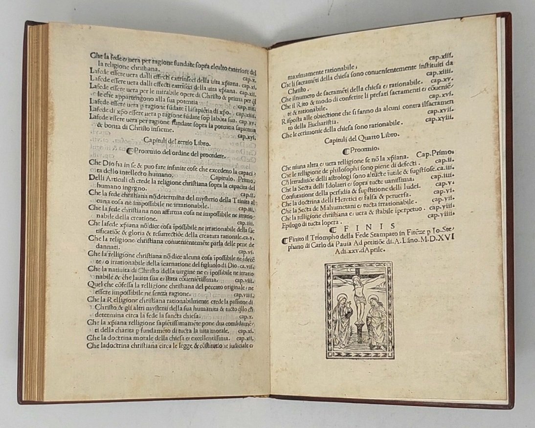 >in-4 (210x140 mm), ff. (76) in bel caratt. tondo, leg. d'amatore a imitazione in pelle, filetti e fregi a secco e dorati sui piatti e al dorso, tagli dorati. Titolo entro splendida larga bordura xilografica, al centro della pagina stupenda vignetta che raffigura Dio Padre che regge Cristo in croce, attorniato da cherubini; altra piccola Crocifissione in fine. (La bordura era già stata usata nell'Arte del ben morire del 1497. Il legno centrale e quello in fine compaiono per la prima volta). Edizione rarissima, esemplare assai bello. SANDER 6878 (tav. 606). CAT. DE MAGISTRIS 1913 n. 281.