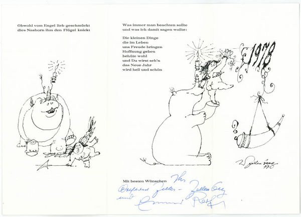 2 Bll. und 12 Farbtafeln. Farbig illustrierte Originalbroschur. Qu.-8vo. Mit eigenh. Widmung und U. des Verfassers. Beiliegend 2 gedr. Billetts mit eigenh. U. O. O., [1975 und 1977]. Hübsches, nicht im Handel erschienenes Bändchen mit Zeller-Zellenbergs Ansichten zum Thema der gleichnamigen Ausstellung der Buchhandlung Zweymüller (Kleine Galerie am Hauptplatz). - Die Billetts als Neujahrsgrüße an den namentlich nicht genannten Dr. Leonhard Zach in Wien. - Wilfried Zeller-Zellenberg wurde vor allem durch seine über 400 Buchillustrationen bekannt, u. a. von Josef Weinheber, Erich Kästner und Kurt Tucholsky. Im Film war der bekannte Illustrator neben Erika Pluhar in Georg Lhotskys 1968 entstandener Verfilmung von Gerhard Fritschs Roman ‘Moos auf den Steinen’ zu sehen. Vgl. Czeike V, 695.