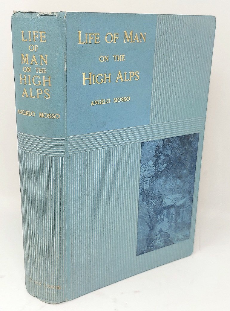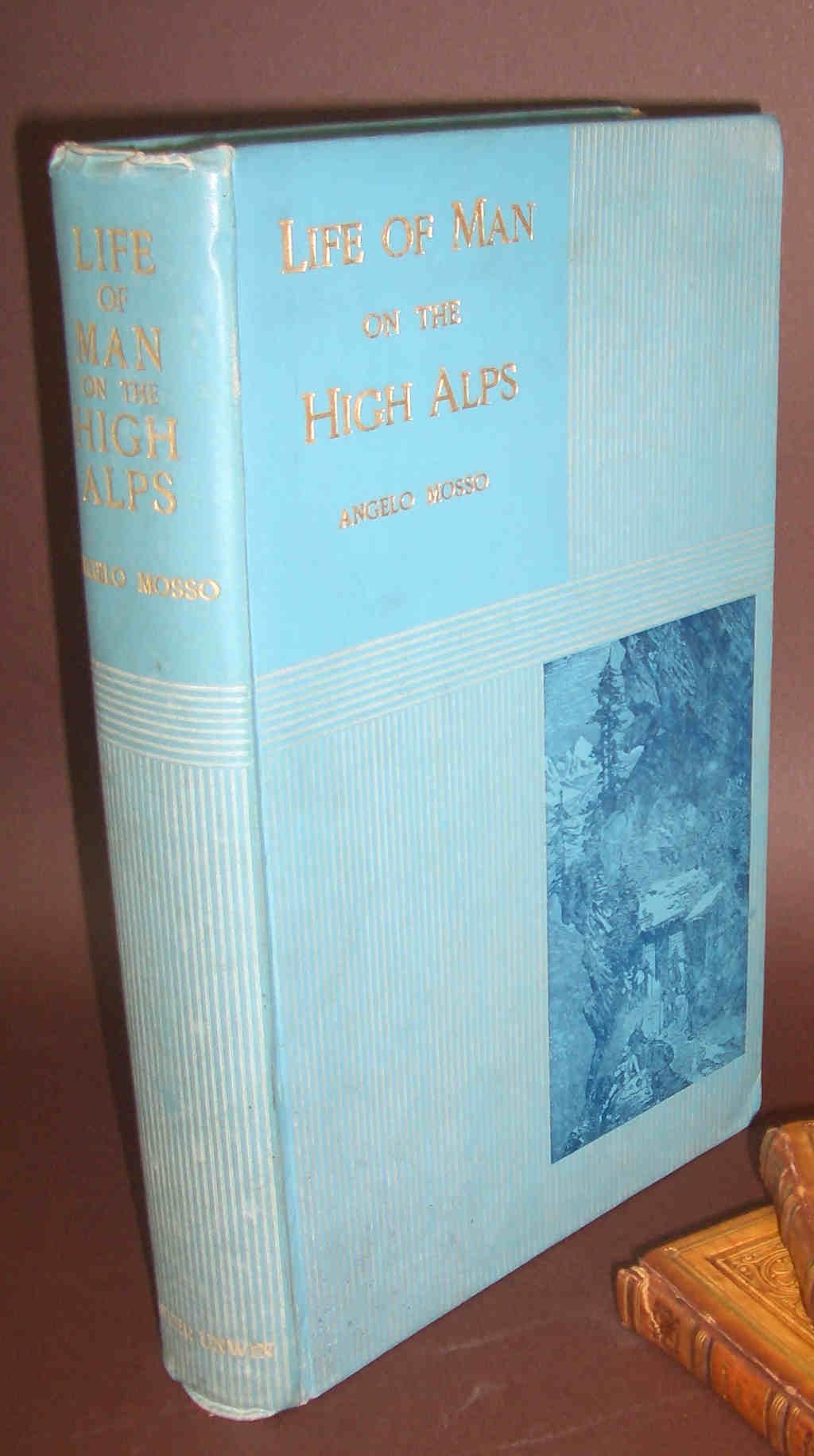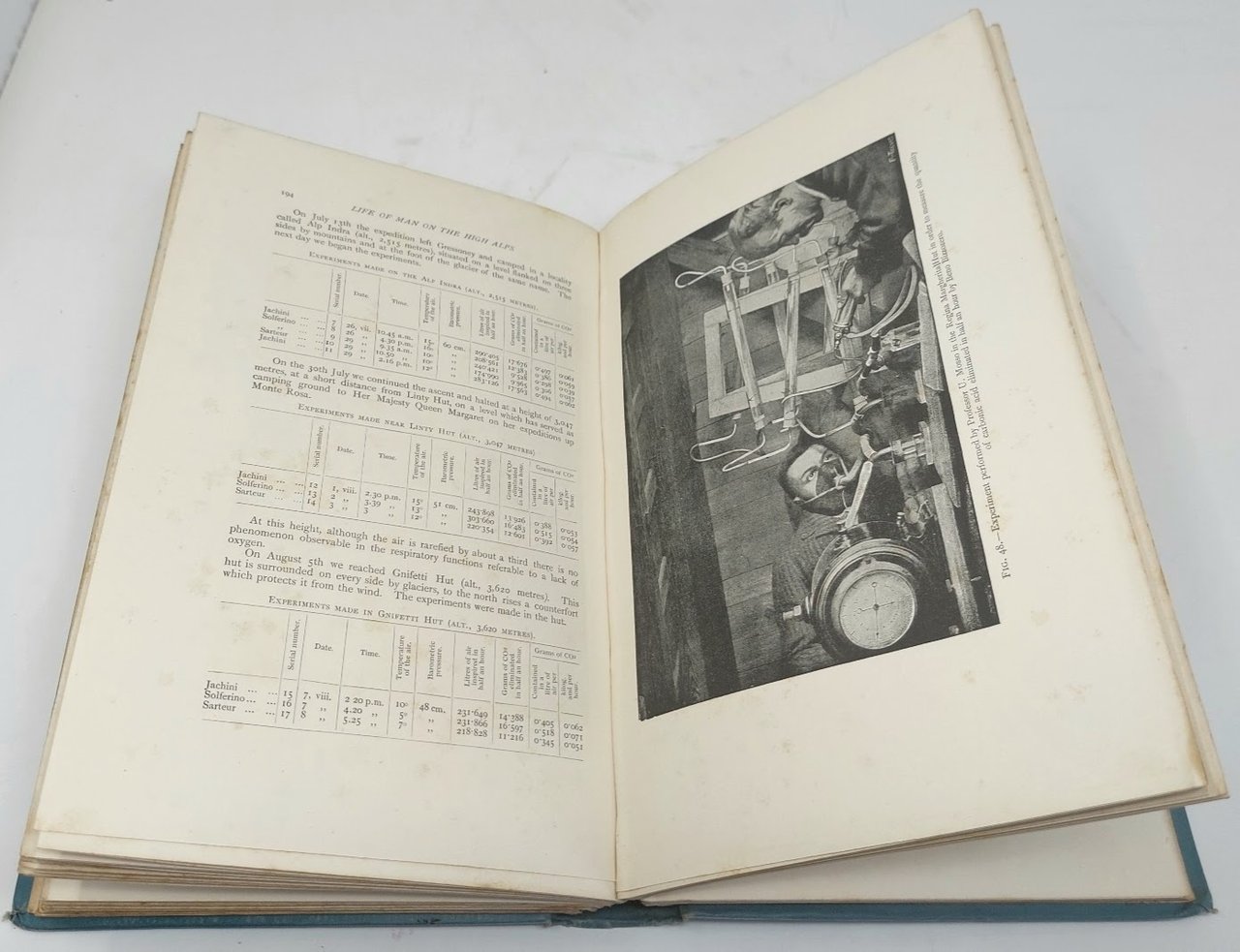 >in-8, pp. XVI, 342, (2), legatura edit. t. tela azzurra con decorazioni a secco ed in oro, taglio superiore dorato Con 65 figure n.t., anche a piena pagina, riproducenti strumenti ed apparecchiture scientifiche, vallate, paesaggi alpini, rifugi, ecc. Prima traduzione inglese di quest'opera importantissima per il contenuto scientifico, grazie ai prolungati studi dell'autore sulla psiche ed il fisico umano che rimane a lungo ad alte quote. La sua diffusione nel mondo anglosassone fu fondamentale per le scalate delle cime himalayane. Ottimo esemplare.