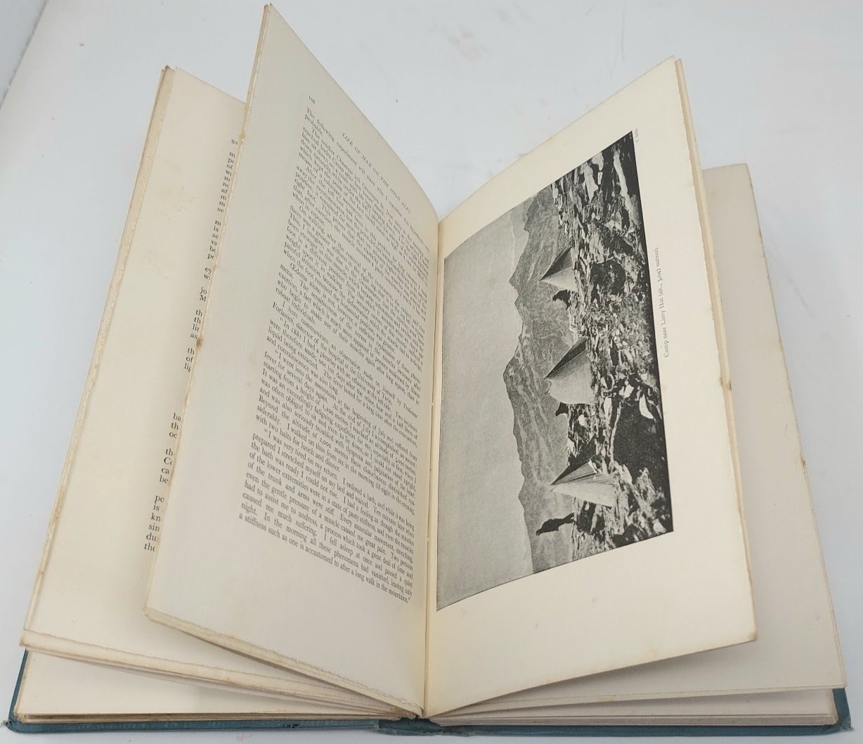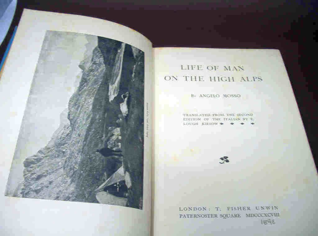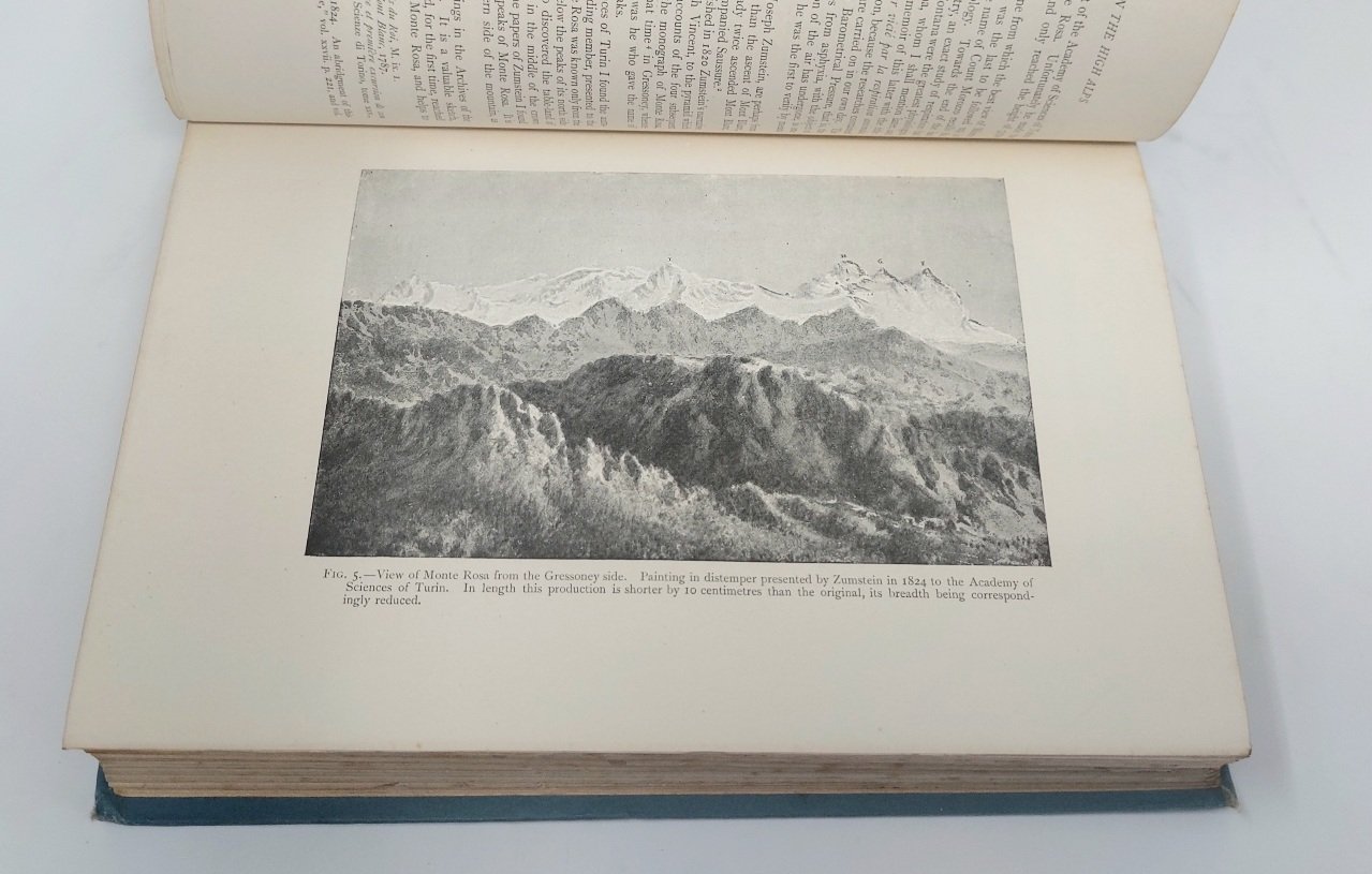 >in-8, pp. XVI, 342, (2), legatura edit. t. tela azzurra con decorazioni a secco ed in oro, taglio superiore dorato Con 65 figure n.t., anche a piena pagina, riproducenti strumenti ed apparecchiture scientifiche, vallate, paesaggi alpini, rifugi, ecc. Prima traduzione inglese di quest'opera importantissima per il contenuto scientifico, grazie ai prolungati studi dell'autore sulla psiche ed il fisico umano che rimane a lungo ad alte quote. La sua diffusione nel mondo anglosassone fu fondamentale per le scalate delle cime himalayane. Ottimo esemplare.