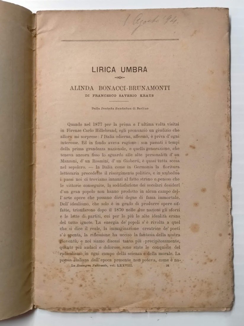 Lirica umbra: Alinda Bonacci Brunamonti (Dalla Deutsche Rundschau di Berlino).