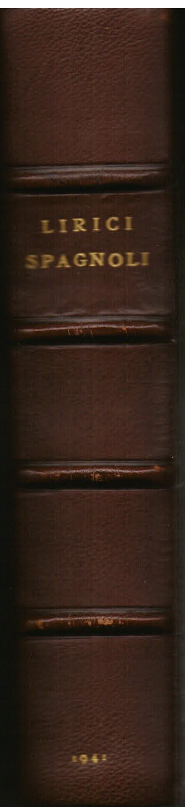 In-8°, pp. 367, (11), legatura m. marocchino rosso e angoli con titolo in oro su dorso a nervetti. Piatti e sguardie marmorizzate, segnacolo, taglio di testa dorato. Testo spagnolo con versione italiana a fronte. Perfetto esemplare. Prima edizione, nella tiratura di testa di soli 50 esemplari numerati fuori commercio su carta a mano (n° 3). Versioni da Machado, Jimenez, Villalón, Villanova, Salinas, Guillén, Gerardo Diego, Lorca, Alberti, Cernuda, Josefina de la Torre.