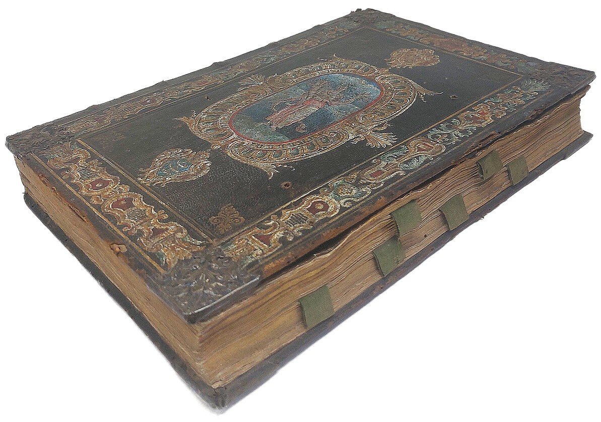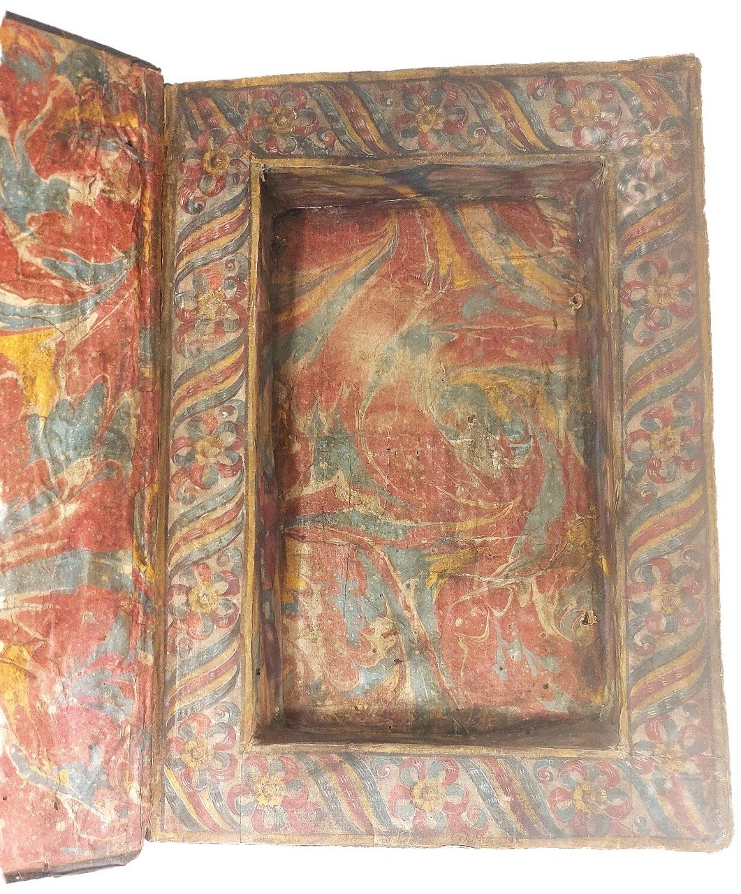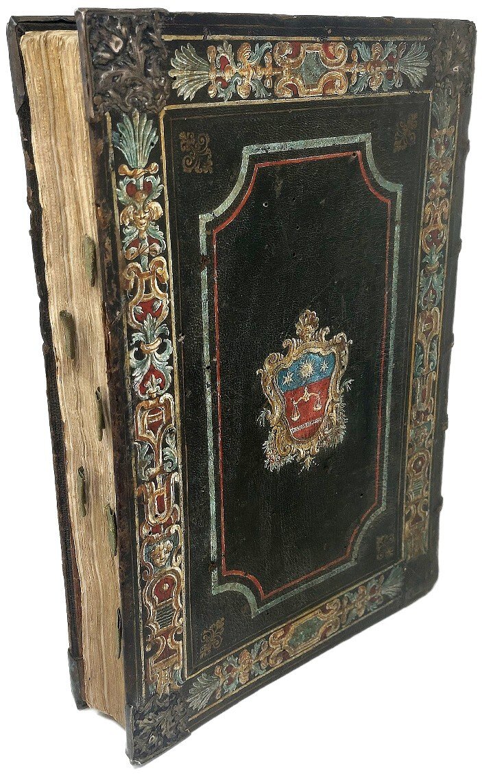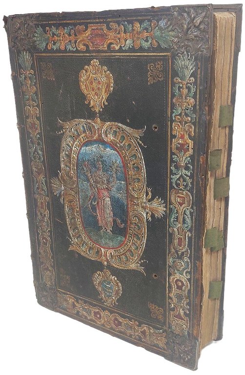 >Legatura settecentesca (393x275 mm), piatti su assicelle rivestiti in pelle dipinta a mano. Al centro del piatto anteriore entro cornice ovale, è raffigurata l'allegoria dell'agricoltura simbolo di fertilità, la donna sorregge una cornucopia di fiori e spine di grano. Ai due estremi sono presenti le armi delle famiglie Medici e Guicciardini. Il tutto è racchiuso entro cornice con mascheroni e grotteschi, sormontata dal motto "Semper". Al centro del piatto posteriore figurano le armi di una terza famiglia. 7 fermagli argentati con foglie di acanto proteggono i 4 angoli di ciascun piatto ( manca un fermaglio al piatto posteriore), tagli dorati. “Faux livre ou livre à secret” del XVIII secolo, usato per nascondere epistolari o piccoli tesori. Le pagine di questo vecchio antifonario sono state anticamente tagliate, incollate e in parte dipinte a mano e rivestite di carta antica, il vano nascondiglio misura 295x160mm. Mancanze al dorso, qualche forellino di tarlo, traccia di antichi legacci. Oggetto curioso e di non facile reperibilità.