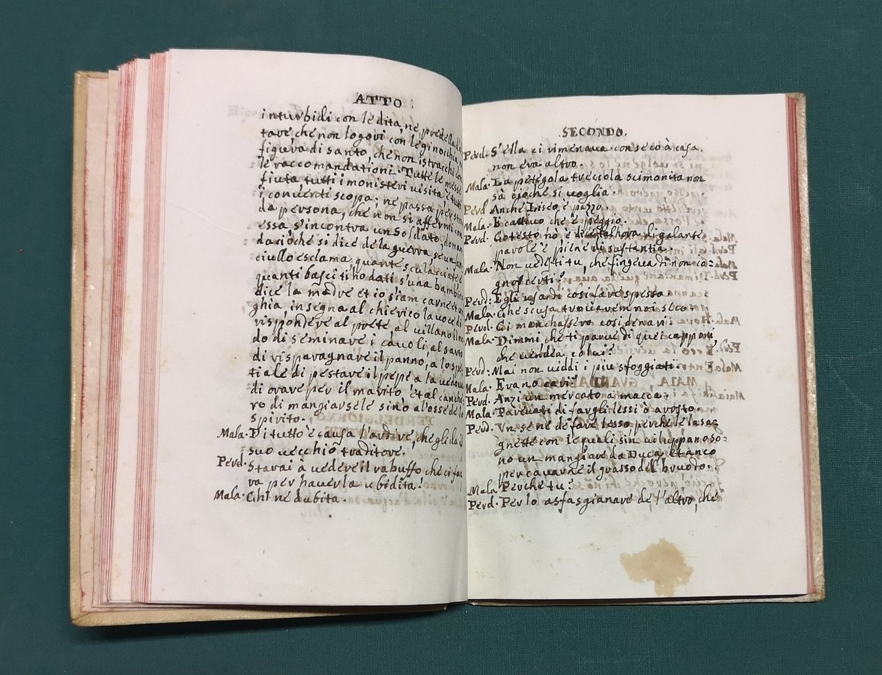 >In-8 (17x11,4), ff. (94), leg. p. perg. rigida seicentesca, titolo su tassello al dorso, tagli rossi. Manoscritto in bel corsivo seicentesco, vergato con inchiostro bruno e attribuibile, per via della firma sul foglio di risguardo anter. e dell'iscr. al frontespizio ("scripsit B.A."), al gesuita Bartolomeo Amici (1562-1649), professore di filosofia a Napoli e commentatore di Aristotele. Copia fedele dell'edizione Marcolini (riproduzione della impresa tipografica "veritas filia temporis", stessa dedica dell'autore a Daniello Barbaro posposta al testo e stessa mancanza dell'indicazione numerica nella didascalia delle scene), con una sola e comprensibile differenza nella paginazione (nella Marcolini le carte n.n. risultano essere 72). Nel "Catalogo ragionato di opere stampate per F. Marcolini", a cura di G. Zaccaria (1850), si legge: "Nella libreria De Minicis n'esiste una copia a penna. Il manoscritto sembra del secolo XVII" (p.48). Il presente esemplare è sicuramente quello in questione, appartenuto, appunto, all'Avv. Raffaele De Minicis, bibliofilo e autore delle "Memorie sulla Biografia del Marcolini" che introducono il suddetto catalogo. La citazione viene ripresa dal Casali, "Annali della tipografia di F. Marcolini" (nota 2 a p.136), il quale, tuttavia, seguendo l'errore dell'Allacci (468) e del Mazzuchelli (Vita dell'Aretino), registra come originale un'inesistente edizione di Venezia, Bindoni, 1540. Il Cat. Unico, al n. 2410, registra una contemporanea ediz. 1542, senza luogo né tipografia. Quanto detto è confermato dal fatto che svariate recenti biografie (Diz. Letter. Bompiani, DBIt., ecc.) affermano che ''Lo Hipocrito'' fu scritto tra la fine del 1541 e l'inizio del 1542. La commedia, in cinque atti, in prosa, ha ''un'azione oltremodo complessa, dedotta da fonti plautine, boccaccesche, boiardesche, novellistiche e popolari in genere'' (Renda-Operti p. 66). Bell'esemplare, fresco e marginoso.