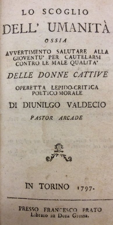 LO SCOGLIO DELL'UMANITA'. - Ossia avvertimento salutare alla gioventù per cautelarsi contro le male qualità delle donne cattive. Operetta lepido-critica, poetico-morale.