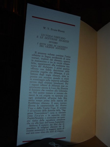 W.Y. Evans-Wentz. Roma, Ubaldini Editore, 1973. Lo Yoga Tibetano e le dottrine segrete ovvero I sette libri di saggezza del Grande Sentiero. In-8° piccolo, cart. edit. con sovracopertina. 368 pp. Come nuovo. Neg. mens. bianca mob. nero.