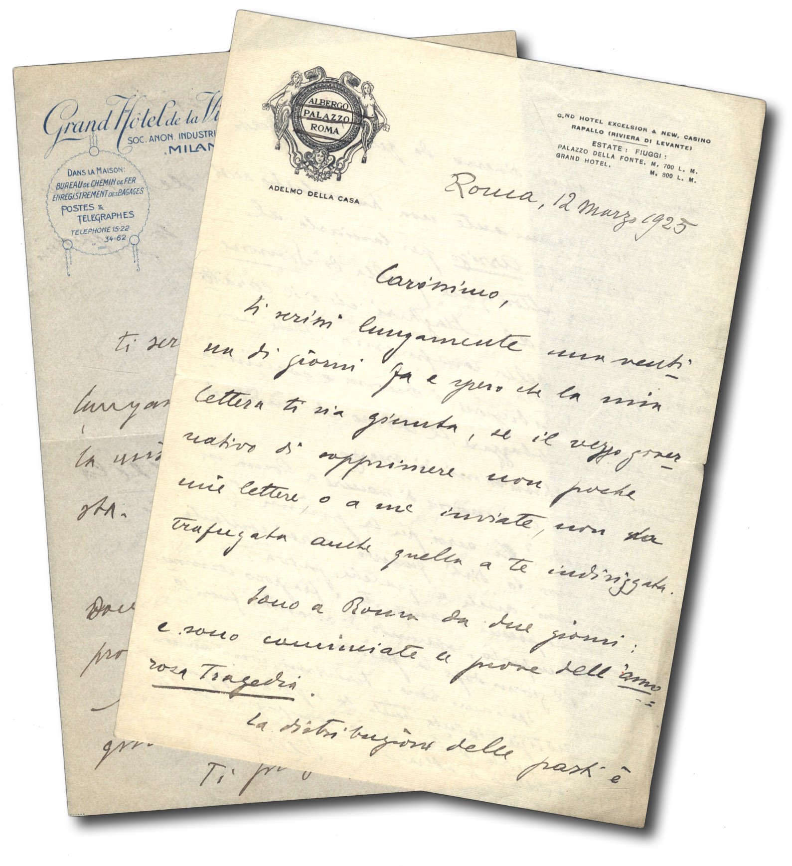 >Lotto di due lettere autografe, la prima su carta intestata ''Albergo Palazzo Roma'', datata Roma 12 Marzo 1925, descrive le prove Dell' ''Amorosa tragedia'': ''Gigetto Almirante non ha voluto accettare la parte di Arrigo per lasciarla al Racca primo attore....la distribuzione delle parti è buona e cominciamo ora ad abbozzare il lavoro che andrà in scena gli ultimissimi di marzo...''. La seconda riguarda la tragedia ''Ali'' (dramma in quattro atti. Milano, Treves, 1921), rappresentato dalla compagnia Borelli-Carminati, 4pp, chiaramente vergate su carta ''Grand Hotel de la Ville, Milan'' datata, milano 27 Feb.1921: ''Domani cominciamo le prove del mio nuovo dramma, Ali, Ed io voglio; ho bisogno di leggerlo a te...La gente è plumbea, ride a sproposito e basta! Sono triste e sono solo: ho bisogno della tua parola fraterna''.