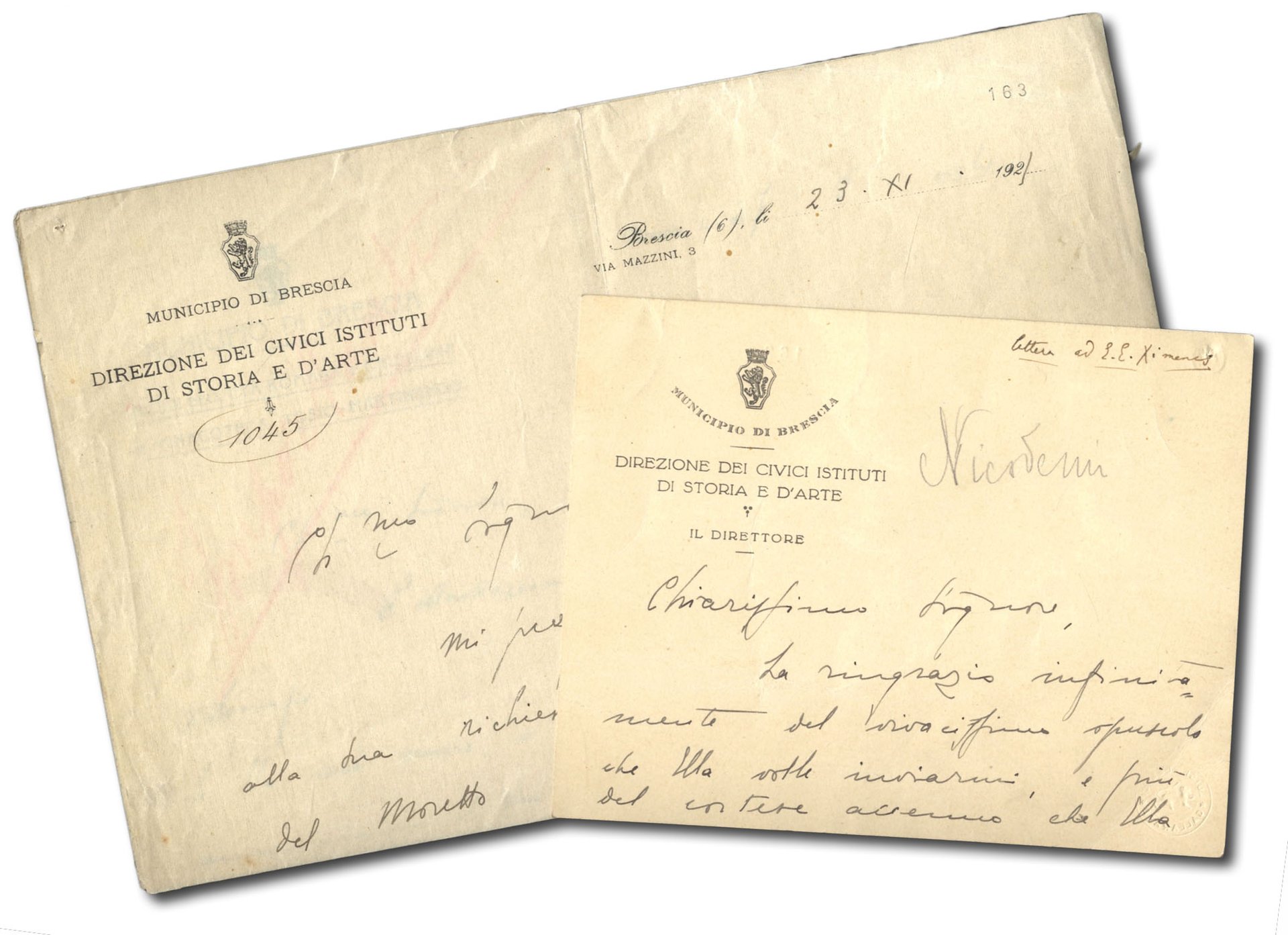 >- 1 pagina in-4 su carta intestata ''Municipio di Brescia. Musei dell'età romana e cristiana e pinacoteca Tosio-Martinengo'' datata Brescia, 24/5/1924 indirizzata a ''Gent.mo Signore'' in cui promette di far vedere al suo interlocutore, in occasione di una visita a Brescia, tutte le edizioni miniate ed illustrate della Commedia di Dante che la Biblioteca ha a disposizione, tra cui quella celebre del 1487. - 1 pagina in-4 su carta intestata ''Municipio di Brescia. Direzione dei Civici Istituti di Storia e d'Arte'' datata Brescia 23/11/1921 indirizzata a ''Ch.mo Signore'' in cui dice di inviare all'anonimo corrispondente una fotografia del quadro del Moretto rappresentante Cristo e un Angelo conservato presso la pinacoteca Tosio-Martinengo di Brescia. - biglietto di ringraziamento su carta intestata ''Municipio di Brescia. Direzione dei Civici Istituti di storia e d'arte. Il Direttore'' senza data e indirizzata a ''Chiarissimo Signore''. L'a. ringrazia per il ''cortese accenno che Ella volle fare della mia modestissima opera di segnalatore del materiale dantesco della Queriniana''. Giorgio Nicodemi fu storico dell'arte e Direttore di importanti musei tra Brescia e Milano.