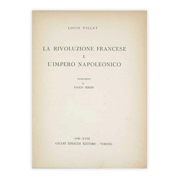 Autore: Louis Villat Titolo: La Rivoluzione Francese e l'Impero Napoleonico Edizione: Einaudi Editore - Finito di stampare il 28 Febbraio 1940 - XVIII Dimensioni: 16,5 x 21,5 cm Peso: 1,14 kg Pagine: 745 Copertina: Cartonato Buone condizioni
