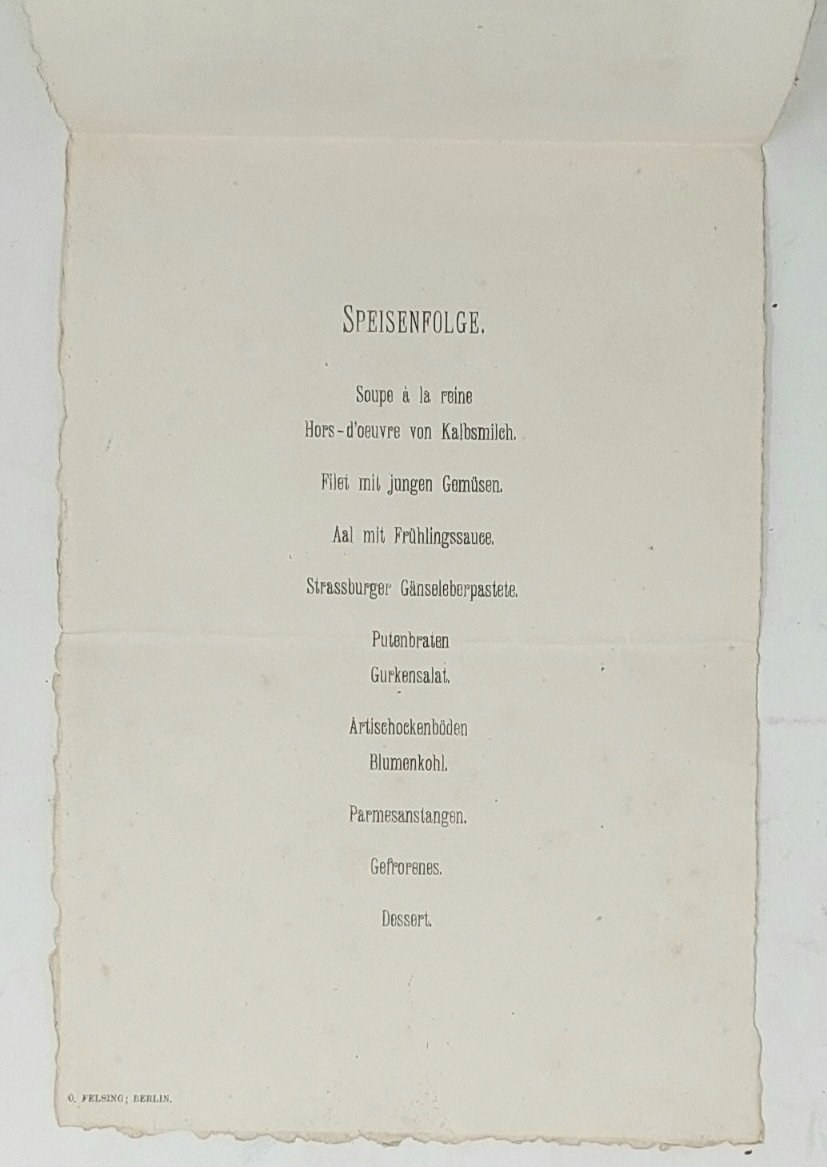 >Menù in cartoncino ripiegato in 2 sul lato corto (232x163 mm), in copertina incisione di Otto Felsing ,all'interno menù (Speisenfolge) di 12 portate. Ben conservato, nota manoscritta e firmata Gleim (segno di piegatura centrale).