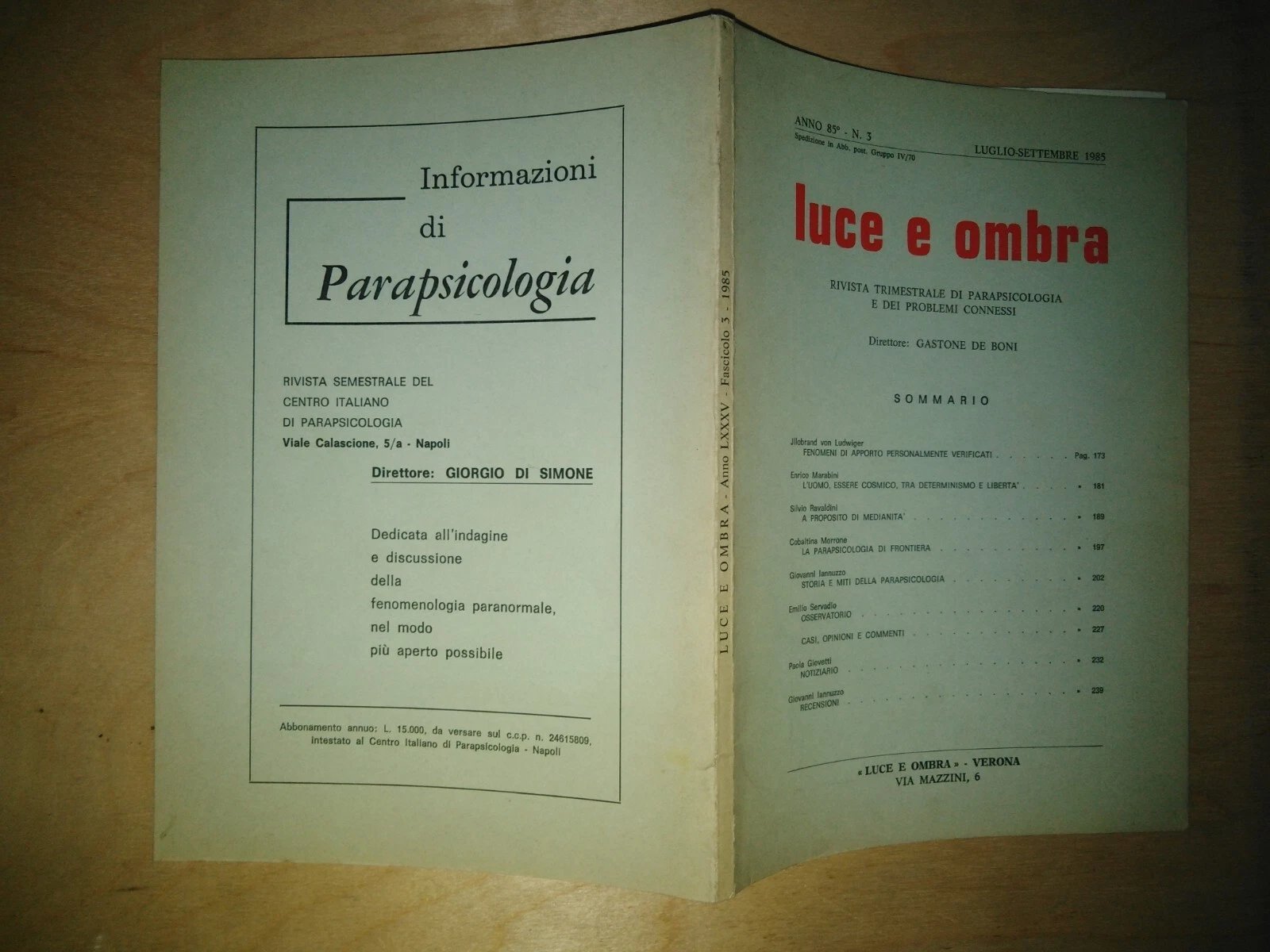 LUCE E OMBRA. trimestrale di parapsicologia e problemi connessi - n. 3 del 1985 | Rare and modern books |