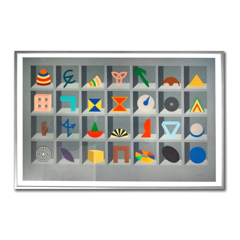 Lucio del Pezzo - Casellario (Multiplo) Casellario è un'opera emblematica di Lucio del Pezzo, caratterizzata da una struttura a griglia che ricorda una "scatola degli oggetti" o un archivio della memoria. L'opera presenta 28 scomparti, ognuno dei quali ospita un diverso simbolo geometrico o iconografico dai colori vivaci, tipici del linguaggio neo-dadaista e pop dell'artista. Dimensioni con cornice: 106 x 156 cmDimensioni senza cornice: 92,5 x 142,5 cm Ottimo stato di conservazione come da immagini