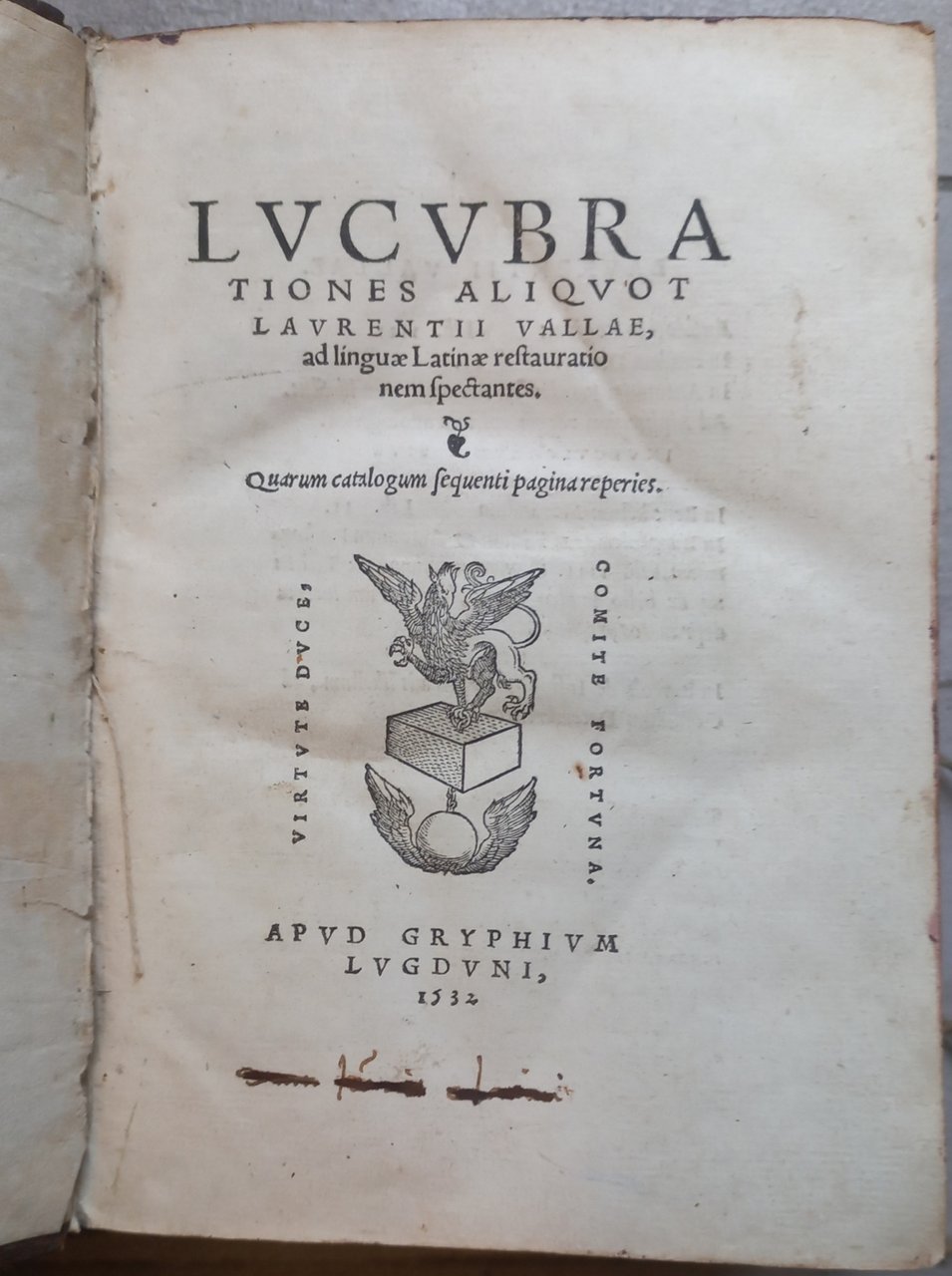 Lorenzo Valla (1407-1457) fu Umanista di famiglia piacentina. Dopo aver condotto i suoi studi a Roma, si trasferì a Pavia dove insegnò eloquenza fino al 1431. Dopo svariati spostamenti nel 1437 si stabilì a Napoli, dove operò come segretario di re Alfonso di Aragona, che costantemente lo protesse. Con le sue spietate critiche alla Chiesa cattolica dell'epoca fu un precursore di Lutero. "Complessa e significativa figura del Quattrocento italiano, Valla esprime la più matura cultura umanistica per la connessione posta tra le humanae litterae e la vita civile, per la polemica contro i barbarismi della cultura scolastica, per l'impegno filologico e storico". Era sua la convinzione che fosse stata proprio un'insufficiente conoscenza del latino la vera causa del linguaggio ambiguo di molti filosofi. H. Baudrier, Bibliographic Lyonnaise..., vol. VIII, p. 65.