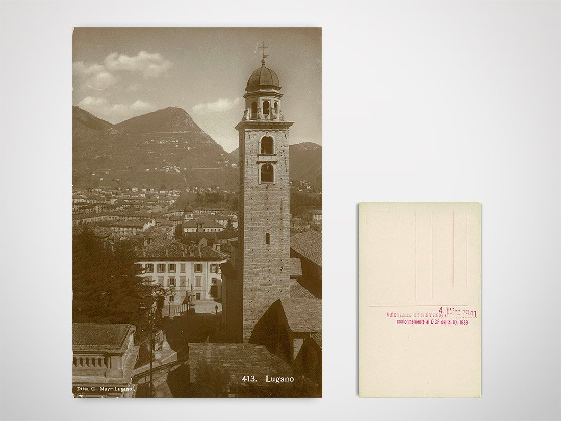Cartolina Lugano funicolare e Cattedrale, timbro in originale di approvazione della Confederazione, non viaggiata Dimensioni: 9 x 14 cm