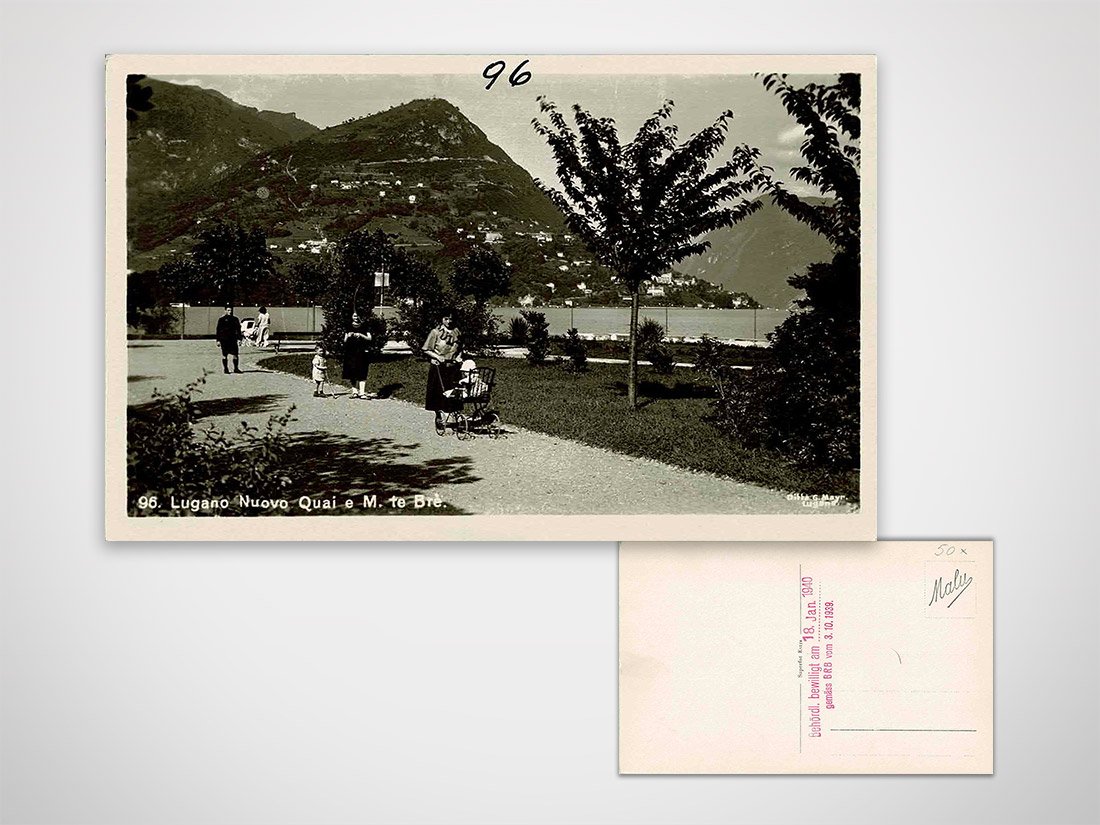 Cartolina Lugano Nuovo Quai e M.Brè, timbro in originale di approvazione della Confederazione, non viaggiata  Dimensioni: 9 x 14 cm